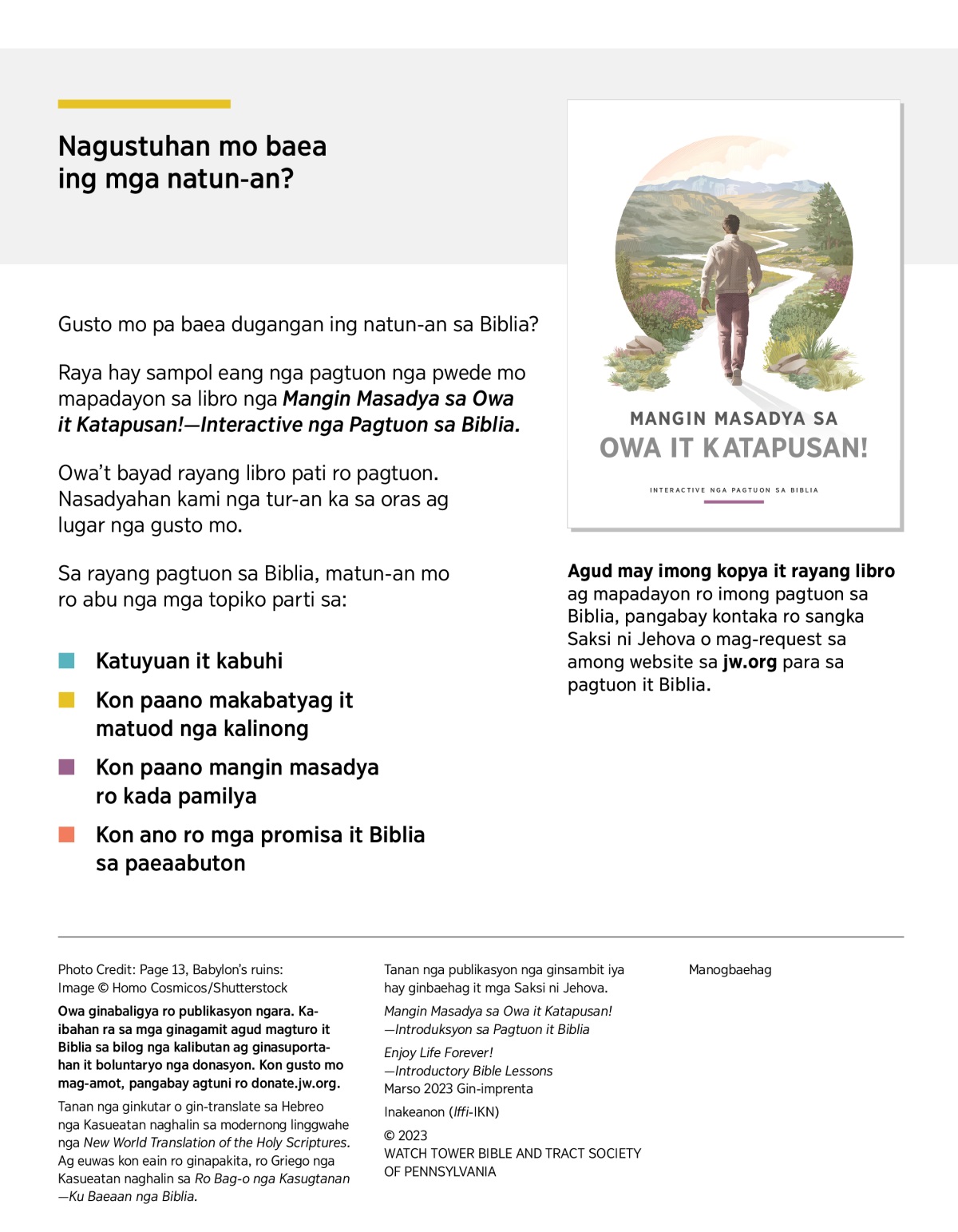 Raya hay sampol eang nga pagtuon nga pwede mo mapadayon sa libro nga Mangin Masadya sa Owa it Katapusan!—Interactive nga Pagtuon sa Biblia.