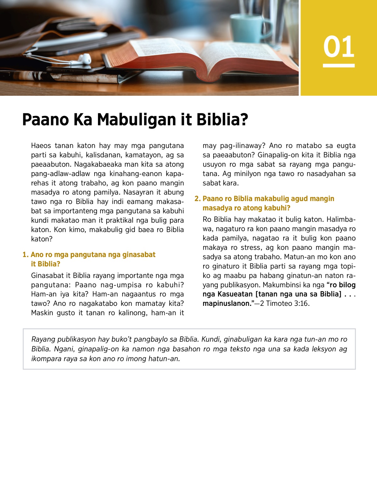 Ginasabat it Biblia rayang importante nga mga pangutana: Paano nag-umpisa ro kabuhi? Ham-an iya kita? Ham-an nagaantus ro mga tawo? Ano ro nagakatabo kon mamatay kita? Maskin gusto it tanan ro kalinong, ham-an it may pag-ilinaway? Ano ro matabo sa eugta sa paeaabuton? Ginapalig-on kita it Biblia nga usuyon ro mga sabat sa rayang mga pangutana. Ag minilyon nga tawo ro nasadyahan sa sabat kara.