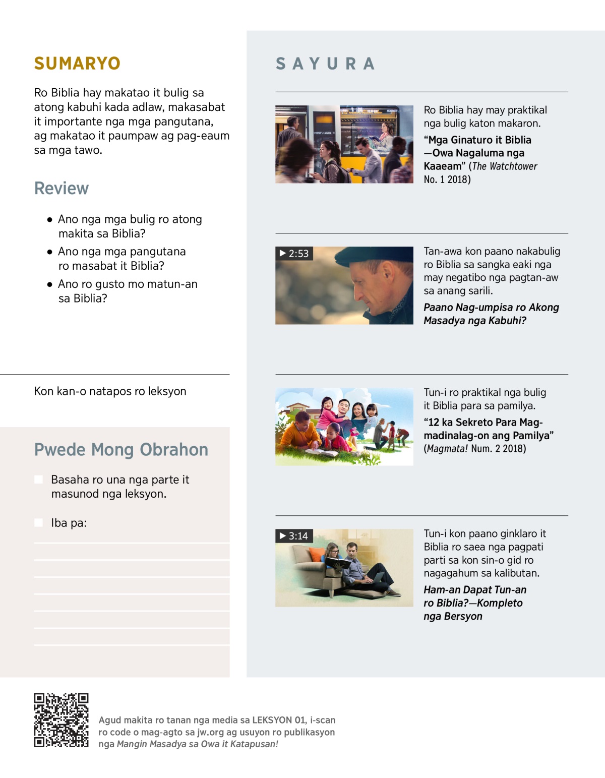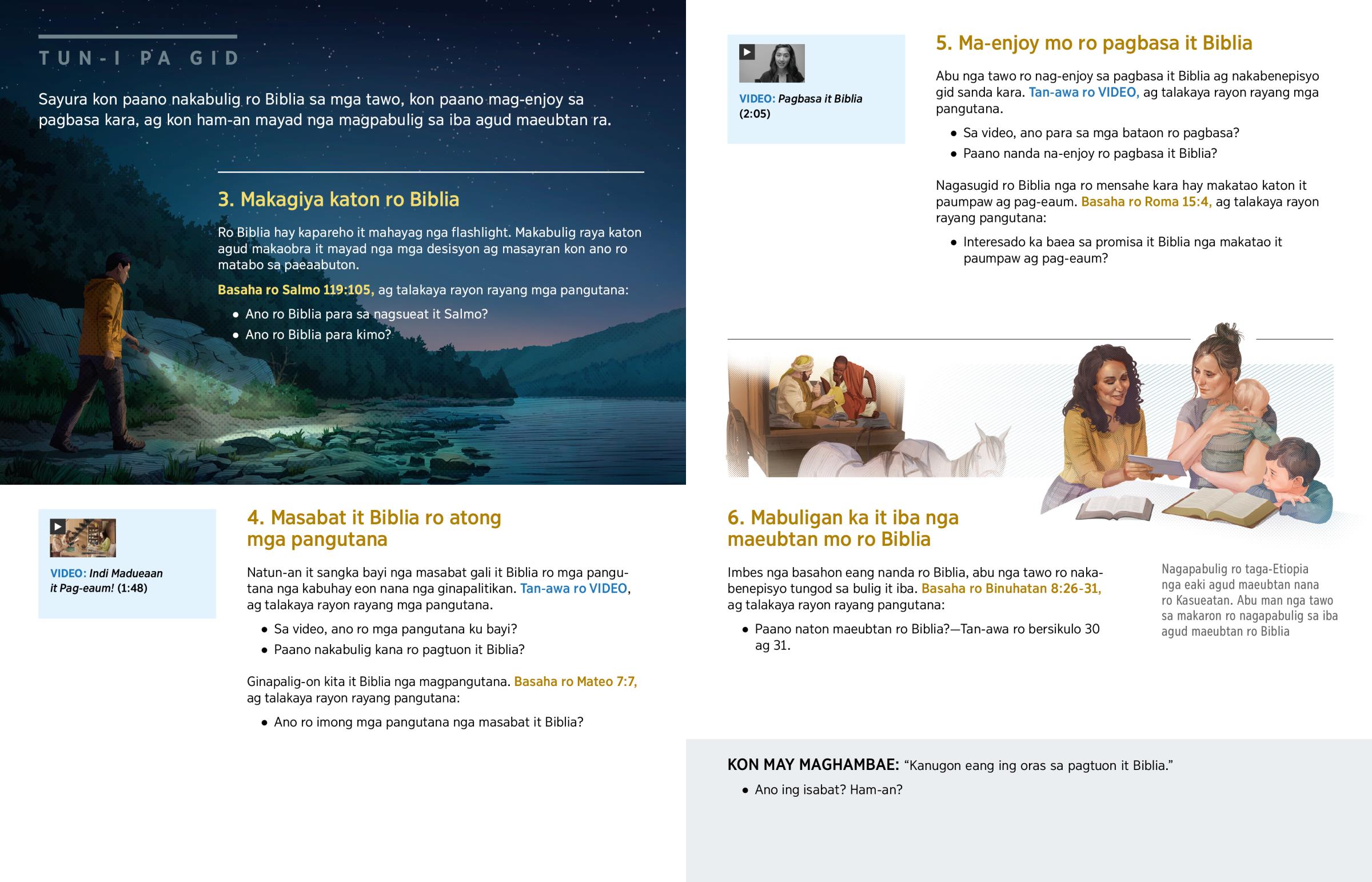 Sayura kon paano nakabulig ro Biblia sa mga tawo, kon paano mag-enjoy sa pagbasa kara, ag kon ham-an mayad nga magpabulig sa iba agud maeubtan ra.
