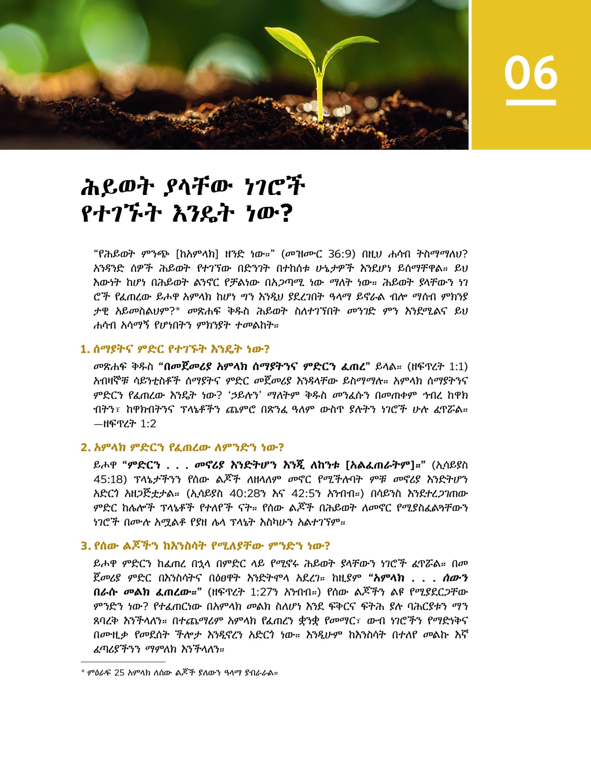 መጽሐፍ ቅዱስ በዘፍጥረት ምዕራፍ 1 ላይ ምድርና በላይዋ ላይ ያለው ሕይወት ስለተገኙበት መንገድ ይገልጻል። ይህ ዘገባ እምነት የሚጣልበት ነው ወይስ አፈ ታሪክ? ቪዲዮውን ተመልከቱ፤ ከዚያም በሚከተሉት ጥያቄዎች ላይ ተወያዩ፦