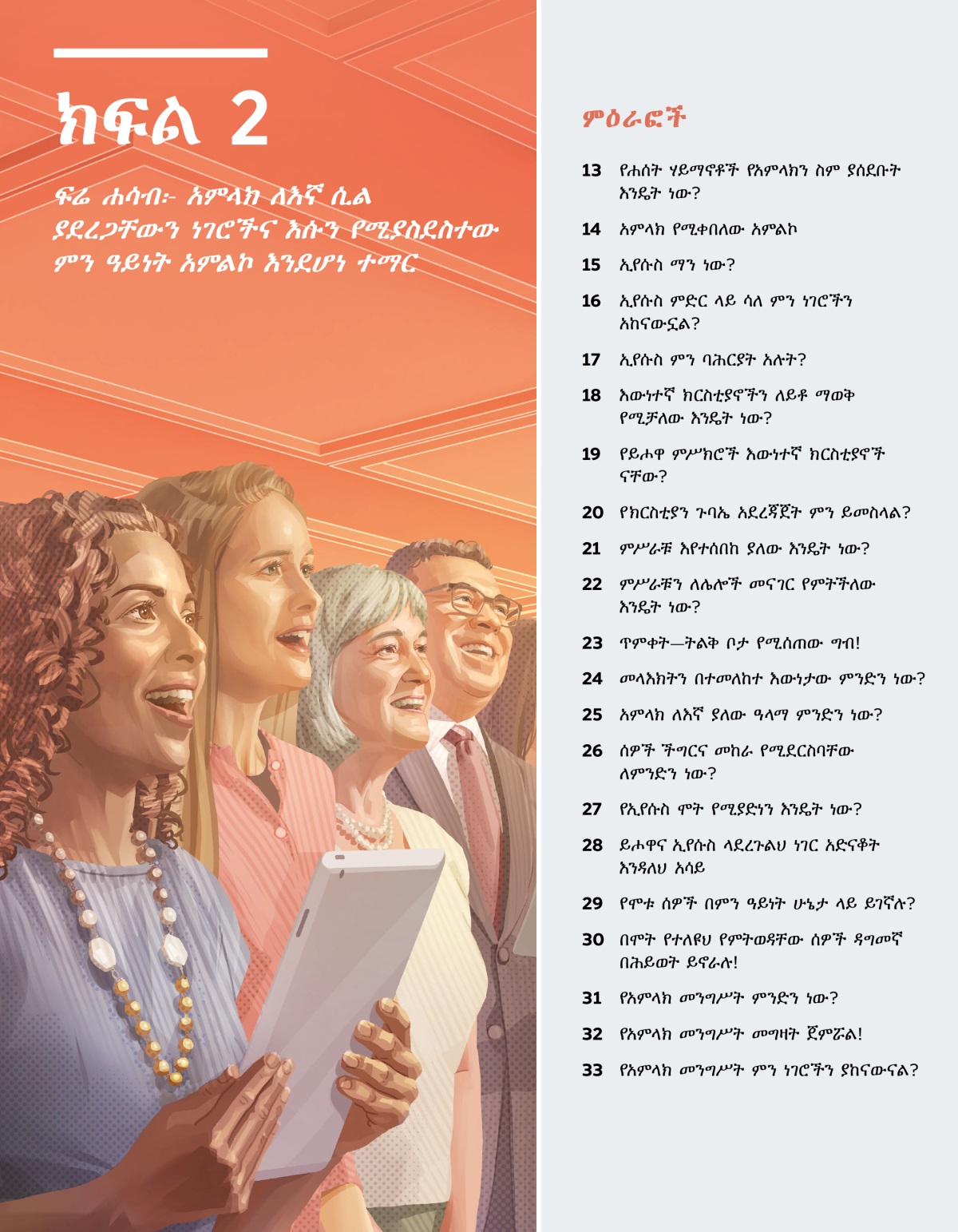 ክፍል 2 በወረቀት የሚታተመው ፍሬ ሐሳብ፦ አምላክ ለእኛ ሲል ያደረጋቸውን ነገሮችና እሱን የሚያስደስተው ምን ዓይነት አምልኮ እንደሆነ ተማር ምዕራፎች 13 የሐሰት ሃይማኖቶች የአምላክን ስም ያሰደቡት እንዴት ነው? 14 አምላክ የሚቀበለው አምልኮ 15 ኢየሱስ ማን ነው? 16 ኢየሱስ ምድር ላይ ሳለ ምን ነገሮችን አከናውኗል? 17 ኢየሱስ ምን ባሕርያት አሉት? 18 እውነተኛ ክርስቲያኖችን ለይቶ ማወቅ የሚቻለው እንዴት ነው? 19 የይሖዋ ምሥክሮች እውነተኛ ክርስቲያኖች ናቸው? 20 የክርስቲያን ጉባኤ አደረጃጀት ምን ይመስላል? 21 ምሥራቹ እየተሰበከ ያለው እንዴት ነው? 22 ምሥራቹን ለሌሎች መናገር የምትችለው እንዴት ነው? 23 ጥምቀት—ትልቅ ቦታ የሚሰጠው ግብ! 24 መላእክትን በተመለከተ እውነታው ምንድን ነው? 25 አምላክ ለእኛ ያለው ዓላማ ምንድን ነው? 26 ሰዎች ችግርና መከራ የሚደርስባቸው ለምንድን ነው? 27 የኢየሱስ ሞት የሚያድነን እንዴት ነው? 28 ይሖዋና ኢየሱስ ላደረጉልህ ነገር አድናቆት እንዳለህ አሳይ 29 የሞቱ ሰዎች በምን ዓይነት ሁኔታ ላይ ይገኛሉ? 30 በሞት የተለዩህ የምትወዳቸው ሰዎች ዳግመኛ በሕይወት ይኖራሉ! 31 የአምላክ መንግሥት ምንድን ነው? 32 የአምላክ መንግሥት መግዛት ጀምሯል! 33 የአምላክ መንግሥት ምን ነገሮችን ያከናውናል?
