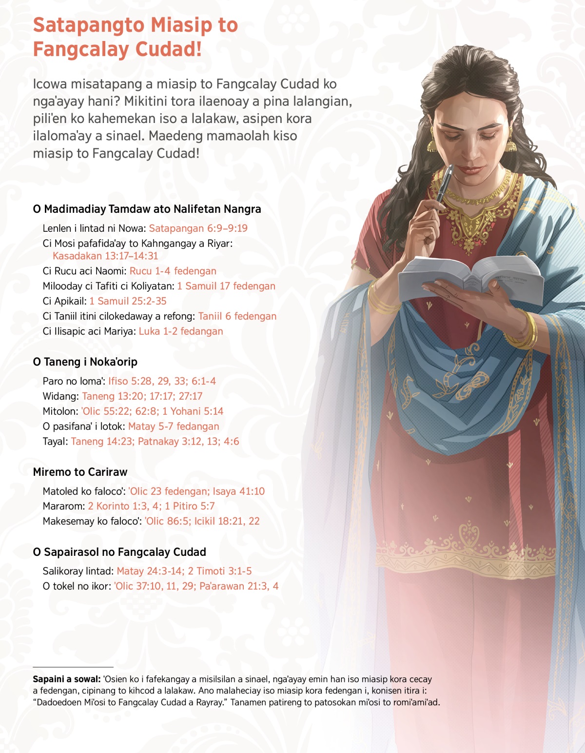 Sapaini a sowal: ˈOsien ko i fafekangay a misilsilan a sinael, ngaˈayay emin han iso miasip kora cecay a fedengan, cipinang to kihcod a lalakaw. Ano malahciay iso miasip kora fedengan i, konisen itira i: “Dadoedoen Miˈosi to Fangcalay Cudad a Rayray.” Tanamen patireng to patosokan miˈosi to romiˈamiˈad.