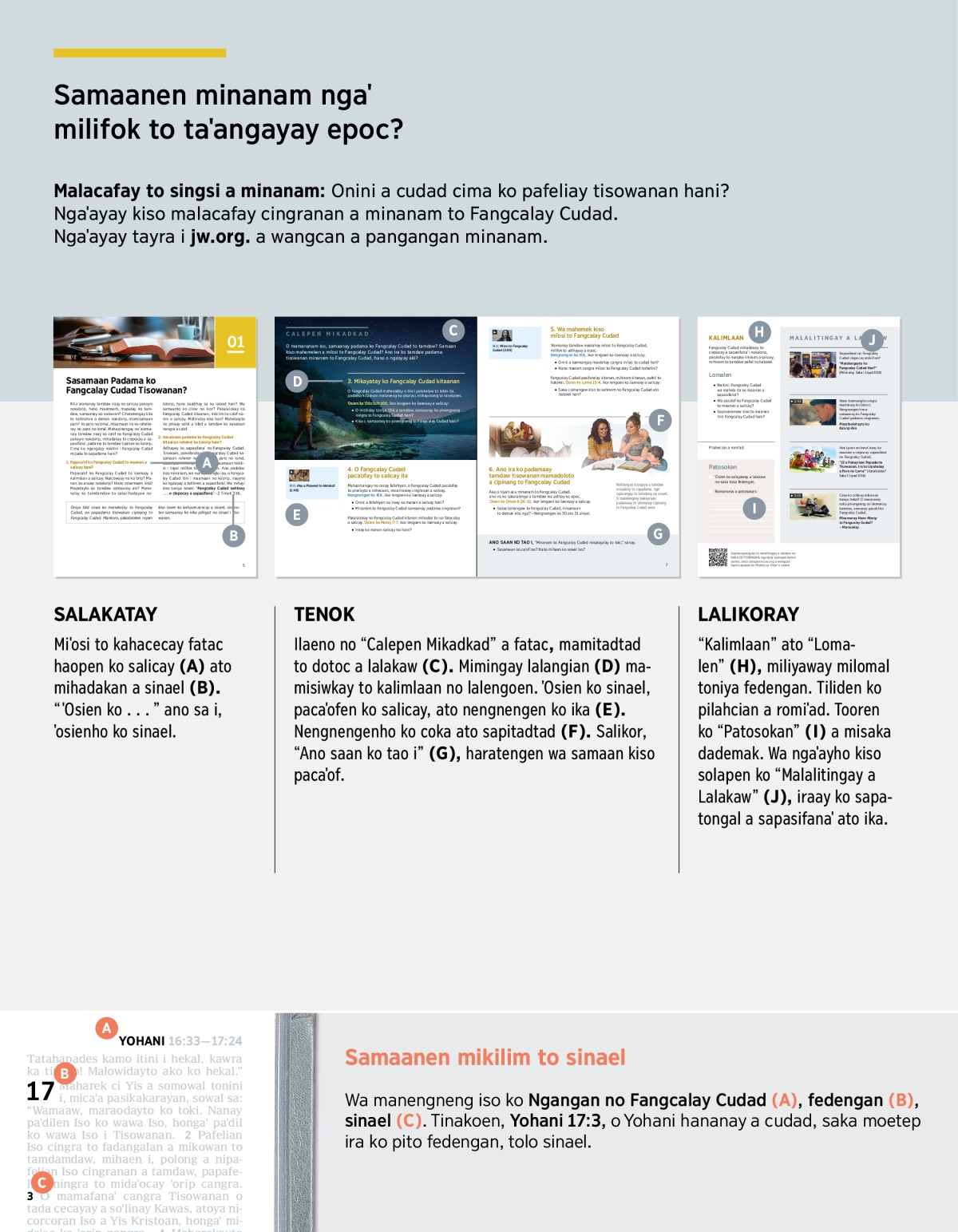 Malacafay to singsi a minanam: Onini a cudad cima ko pafeliay tisowanan hani? Ngaˈayay kiso malacafay cingranan a minanam to Fangcalay Cudad. Ngaˈayay tayra i jw.org. a wangcan a pangangan minanam.