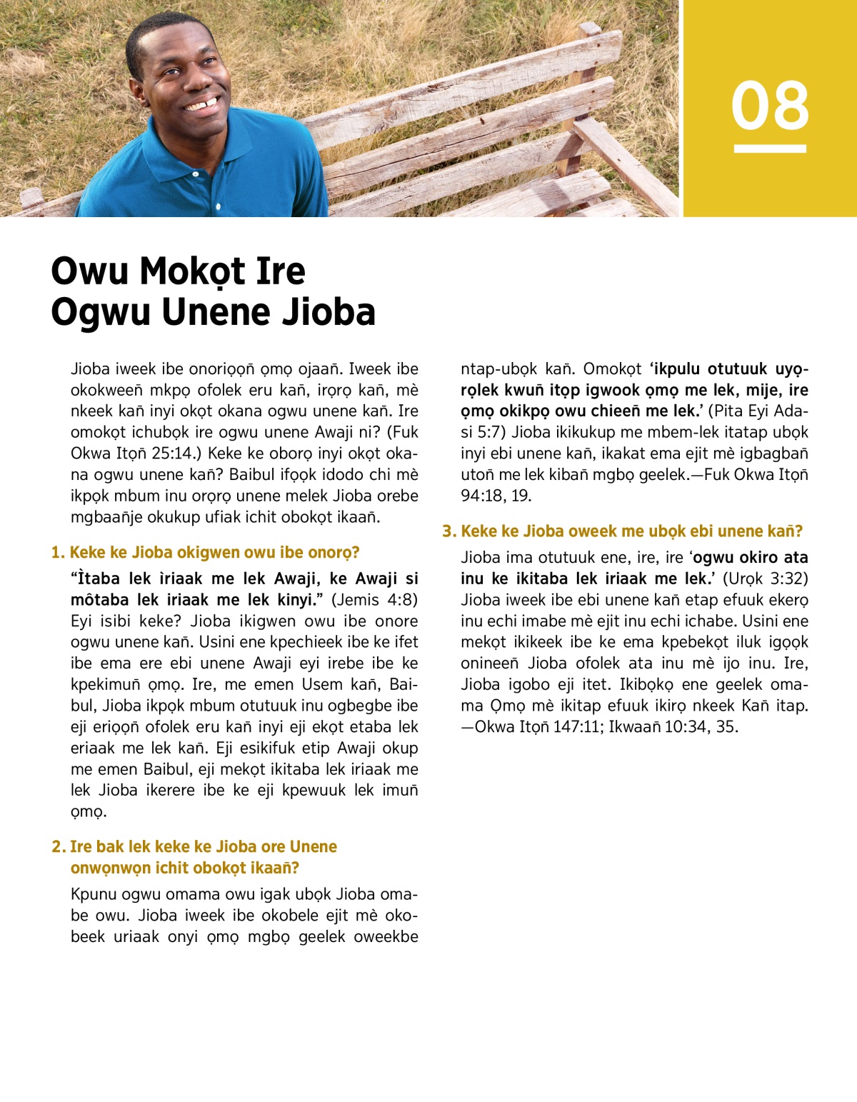 Kpunu ogwu omama owu igak ubọk Jioba omabe owu. Jioba iweek ibe okobele ejit mè okobeek uriaak onyi ọmọ mgbọ geelek oweekbe ntap-ubọk kan̄. Omokọt ‘ikpulu otutuuk uyọrọlek kwun̄ itọp igwook ọmọ me lek, mije, ire ọmọ okikpọ owu chieen̄ me lek.’ (Pita Eyi Adasi 5:7) Jioba ikikukup me mbem-lek itatap ubọk inyi ebi unene kan̄, ikakat ema ejit mè igbagban̄ uton̄ me lek kiban̄ mgbọ geelek.—Fuk Okwa Itọn̄ 94:18, 19.