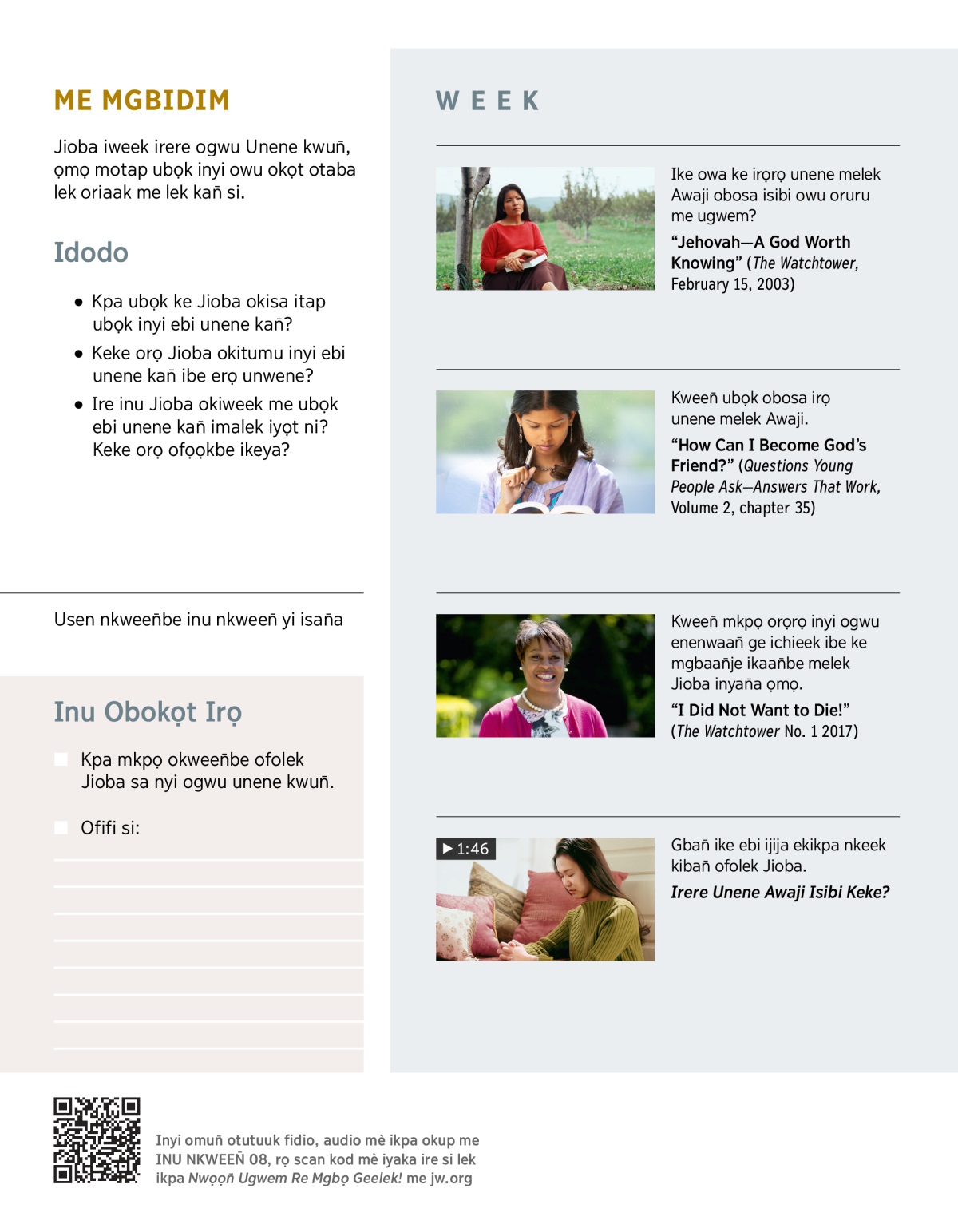“Ìtaba lek ìriaak me lek Awaji, ke Awaji si môtaba lek iriaak me lek kinyi.” (Jemis 4:8) Eyi isibi keke? Jioba ikigwen owu ibe onore ogwu unene kan̄. Usini ene kpechieek ibe ke ifet ibe ema ere ebi unene Awaji eyi irebe ibe ke kpekimun̄ ọmọ. Ire, me emen Usem kan̄, Baibul, Jioba ikpọk mbum otutuuk inu ogbegbe ibe eji eriọọn̄ ofolek eru kan̄ inyi eji ekọt etaba lek eriaak me lek kan̄. Eji esikifuk etip Awaji okup me emen Baibul, eji mekọt ikitaba lek iriaak me lek Jioba ikerere ibe ke eji kpewuuk lek imun̄ ọmọ.