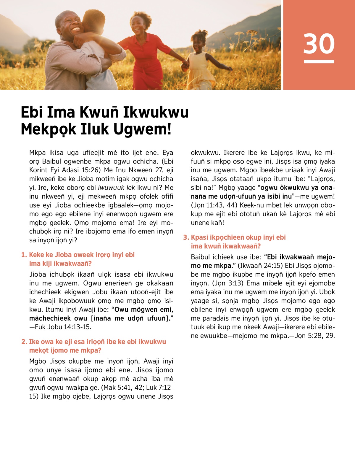Mkpa ikisa uga ufieejit mè ito ijet ene. Eya orọ Baibul ogwenbe mkpa ogwu ochicha. (Ebi Kọrint Eyi Adasi 15:26) Me Inu Nkween̄ 27, eji mikween̄ ibe ke Jioba motim igak ogwu ochicha yi. Ire, keke oborọ ebi iwuwuuk lek ikwu ni? Me inu nkween̄ yi, eji mekween̄ mkpọ ofolek ofifi use eyi Jioba ochieekbe igbaalek—ọmọ mojomo ego ego ebilene inyi enenwọọn̄ ugwem ere mgbọ geelek. Ọmọ mojomo ema! Ire eyi mochubọk irọ ni? Ire ibojomo ema ifo emen inyọn̄ sa inyọn̄ ijọn̄ yi?