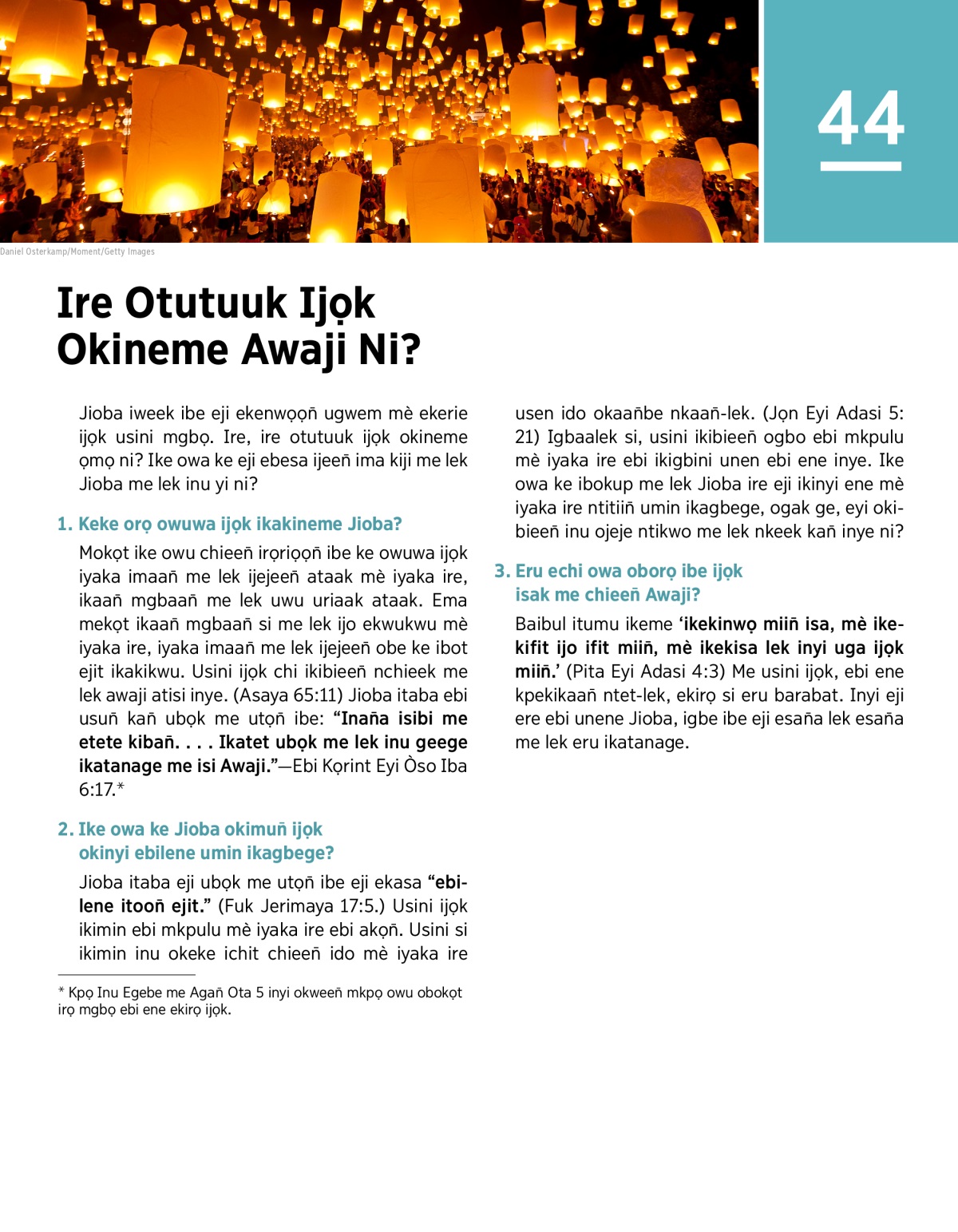 Mokọt ike owu chieen̄ irọriọọn̄ ibe ke owuwa ijọk iyaka imaan̄ me lek ijejeen̄ ataak mè iyaka ire, ikaan̄ mgbaan̄ me lek uwu uriaak ataak. Ema mekọt ikaan̄ mgbaan̄ si me lek ijo ekwukwu mè iyaka ire, iyaka imaan̄ me lek ijejeen̄ obe ke ibot ejit ikakikwu. Usini ijọk chi ikibieen̄ nchieek me lek awaji atisi inye. (Asaya 65:11) Jioba itaba ebi usun̄ kan̄ ubọk me utọn̄ ibe: “Inan̄a isibi me etete kiban̄. . . . Ikatet ubọk me lek inu geege ikatanage me isi Awaji.”—Ebi Kọrint Eyi Òso Iba 6:17.a