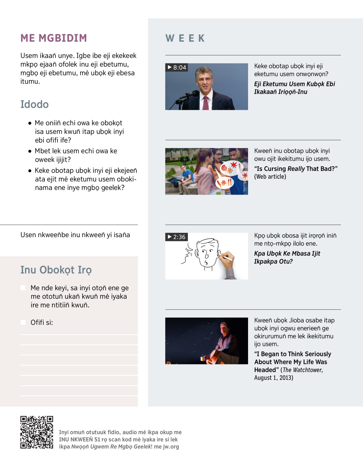 Baibul itumu inyi eji ibe: “Ìkikat ebi melek kinyi ejit, mè ìkitap si ubọk ìbene ebi melek kinyi ìgwuun̄.” (Ebi Teselonaika Eyi Adasi 5:11) Ire omokọt ikeek usini ebi iweweek ukarajit ni? Keke ke oborọ isasa ikat ema ejit? Rọ inyi ema eriọọn̄ ibe ke oma ema. Omokọt itumu inyi ema inu omabe ofolek kiban̄. Ire omokọt ikeek ere Baibul obotap efuuk me owot ogwu oriọọn̄be isi ni? Owuwa ere Baibul omaan̄ obokọt isa irọ mkpọ. Kawuuk si ibe ke usem okitumu mè ubọk okisa itumu mokọt ikaan̄ mgbaan̄ me lek ebi ofifi ife. Eya orọ, kisa inyi okotumu usem me oniin̄ okijeen̄ ima mè ikup dii.—Urọk 15:1.