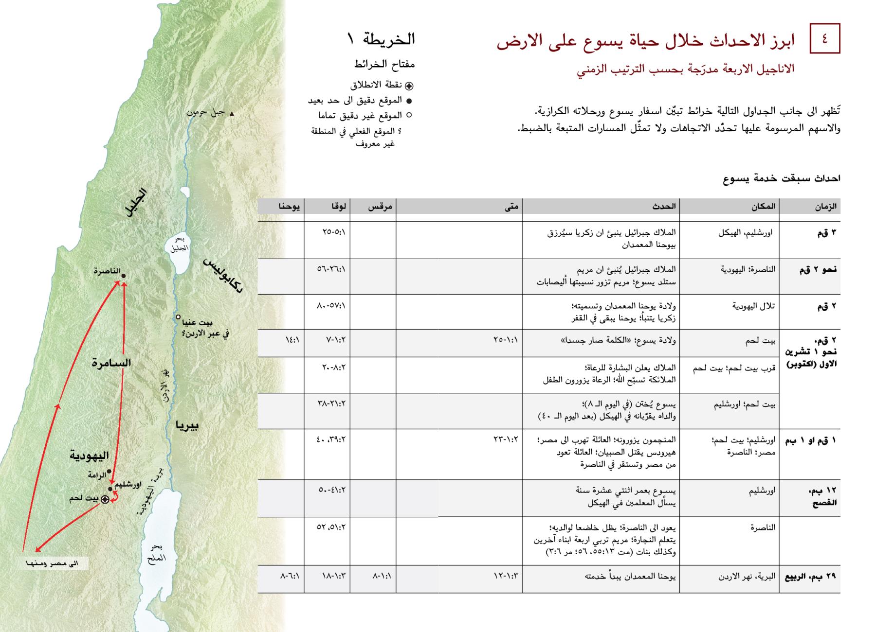 تَظهر الى جانب الجداول التالية خرائط تبيّن اسفار يسوع ورحلاته الكرازية. والاسهم المرسومة عليها تحدّد الاتجاهات ولا تمثّل المسارات المتبعة بالضبط.