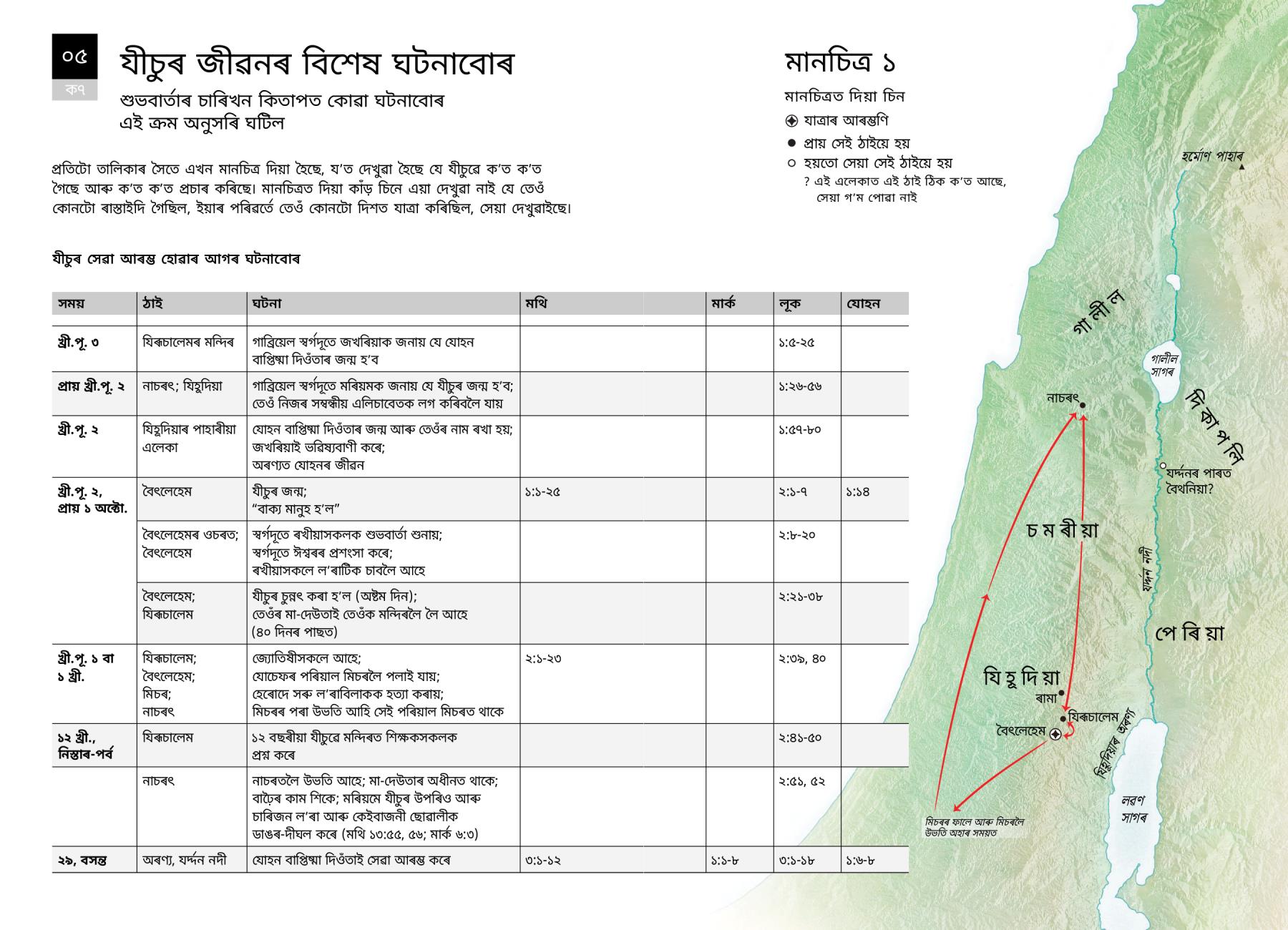 প্ৰতিটো তালিকাৰ সৈতে এখন মানচিত্ৰ দিয়া হৈছে, যʼত দেখুৱা হৈছে যে যীচুৱে কʼত কʼত গৈছে আৰু কʼত কʼত প্ৰচাৰ কৰিছে। মানচিত্ৰত দিয়া কাঁড় চিনে এয়া দেখুৱা নাই যে তেওঁ কোনটো ৰাস্তাইদি গৈছিল, ইয়াৰ পৰিৱৰ্তে তেওঁ কোনটো দিশত যাত্ৰা কৰিছিল, সেয়া দেখুৱাইছে।