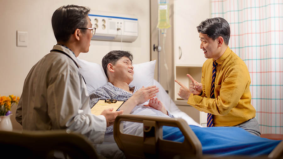 d DESCRIPTION DE L’ILLUSTRATION : Un frère sert d’interprète à un frère sourd pour lui permettre de communiquer avec un médecin.