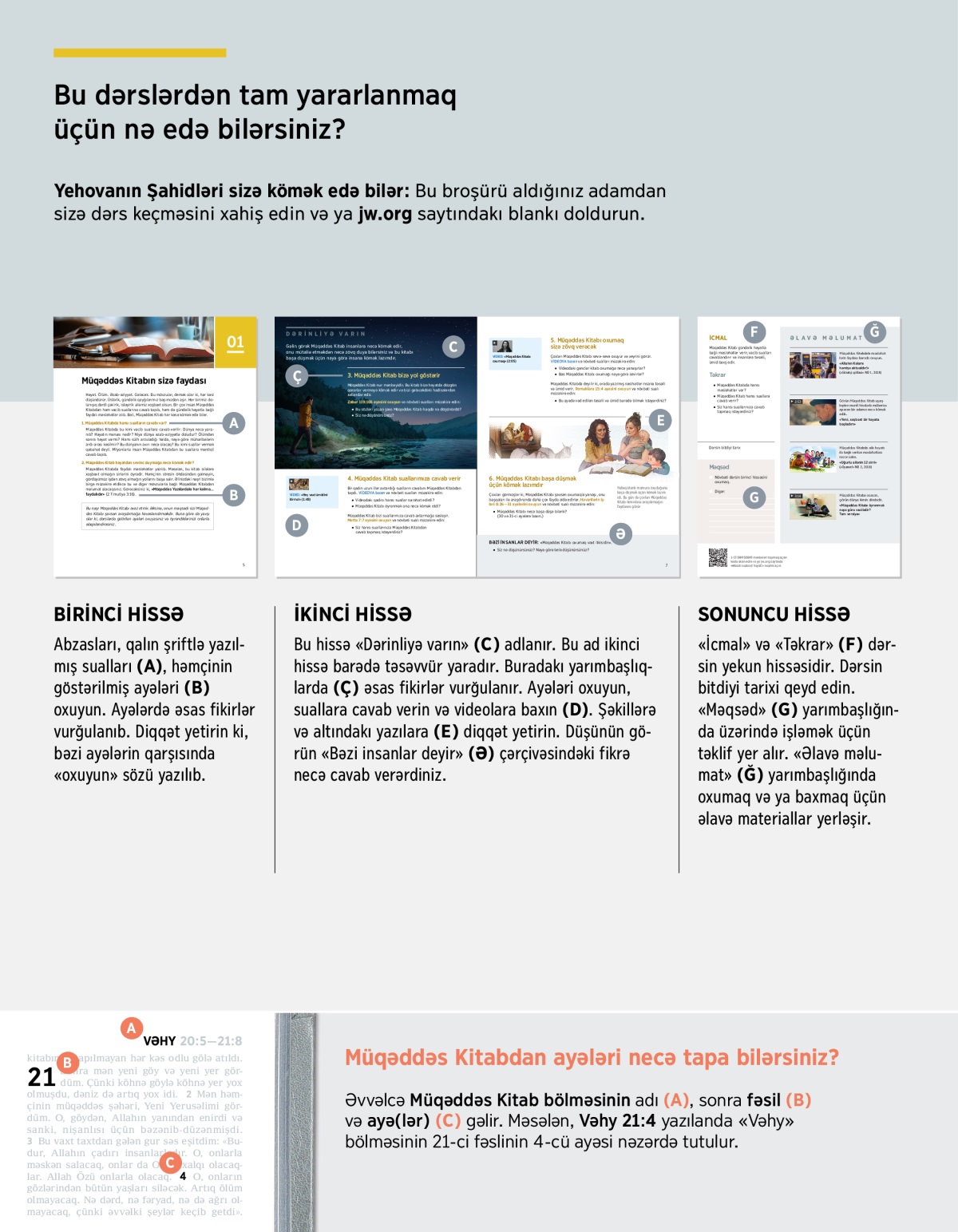 Abzasları, qalın şriftlə yazılmış sualları (A), həmçinin göstərilmiş ayələri (B) oxuyun. Ayələrdə əsas fikirlər vurğulanıb. Diqqət yetirin ki, bəzi ayələrin qarşısında «oxuyun» sözü yazılıb.