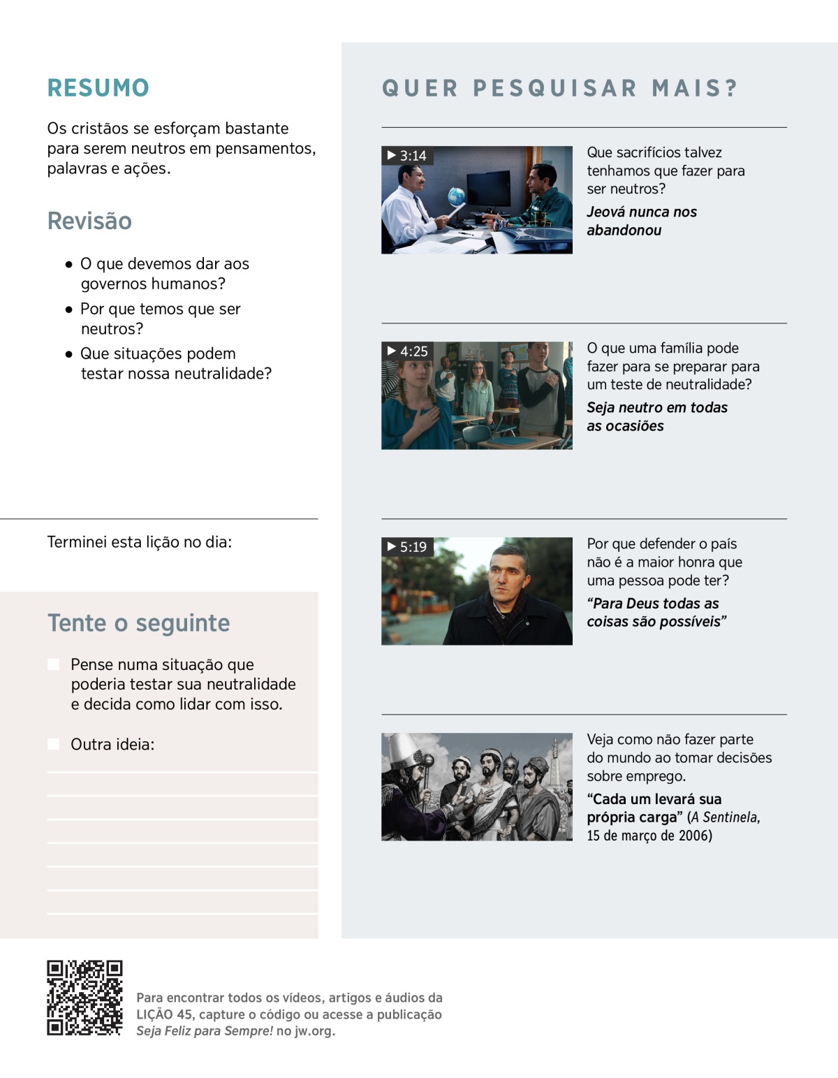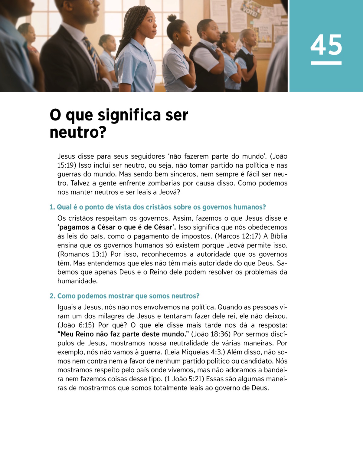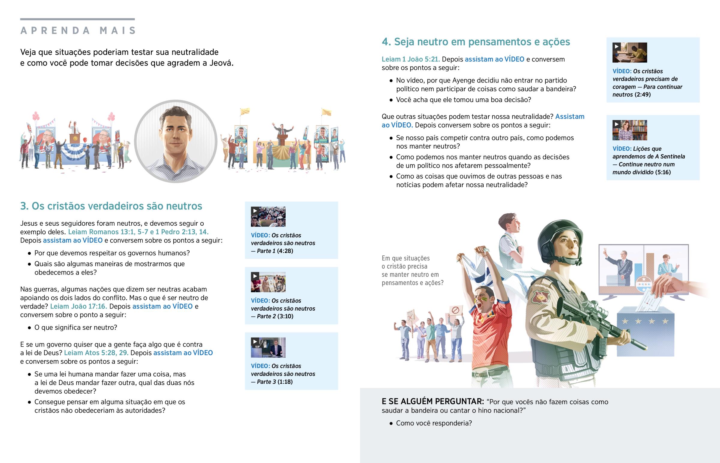 Jesus e seus seguidores foram neutros, e devemos seguir o exemplo deles. Leiam Romanos 13:1, 5-7 e 1 Pedro 2:13, 14. Depois assistam ao VÍDEO e conversem sobre os pontos a seguir: