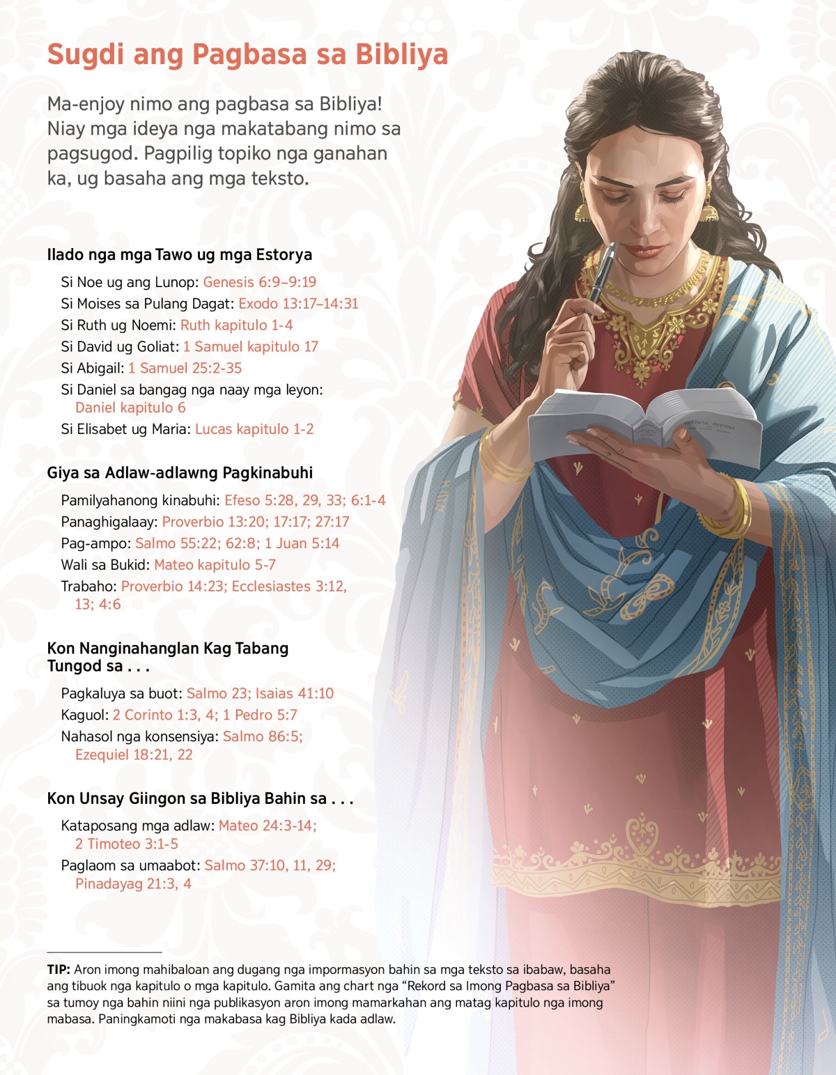 TIP: Aron imong mahibaloan ang dugang nga impormasyon bahin sa mga teksto sa ibabaw, basaha ang tibuok nga kapitulo o mga kapitulo. Gamita ang chart nga “Rekord sa Imong Pagbasa sa Bibliya” sa tumoy nga bahin niini nga publikasyon aron imong mamarkahan ang matag kapitulo nga imong mabasa. Paningkamoti nga makabasa kag Bibliya kada adlaw.