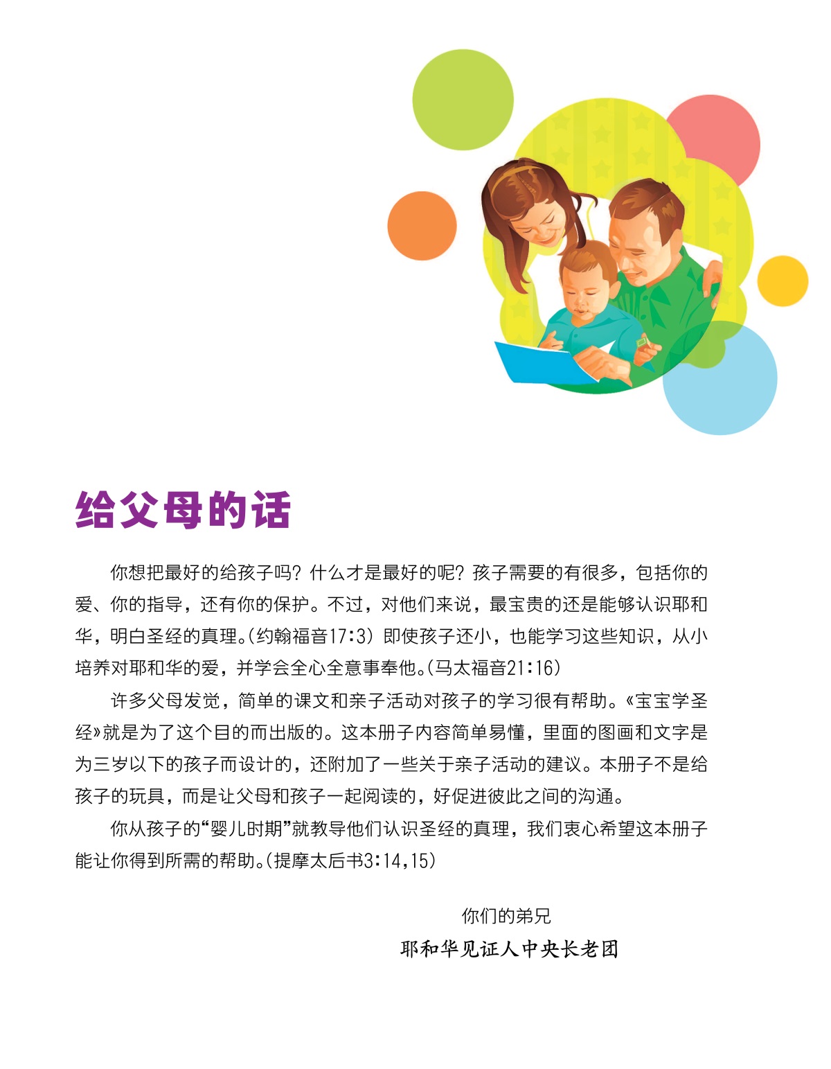 许多父母发觉,简单的课文和亲子活动对孩子的学习很有帮助。《宝宝学圣经》就是为了这个目的而出版的。这本册子内容简单易懂,里面的图画和文字是为三岁以下的孩子而设计的,还附加了一些关于亲子活动的建议。本册子不是给孩子的玩具,而是让父母和孩子一起阅读的,好促进彼此之间的沟通。