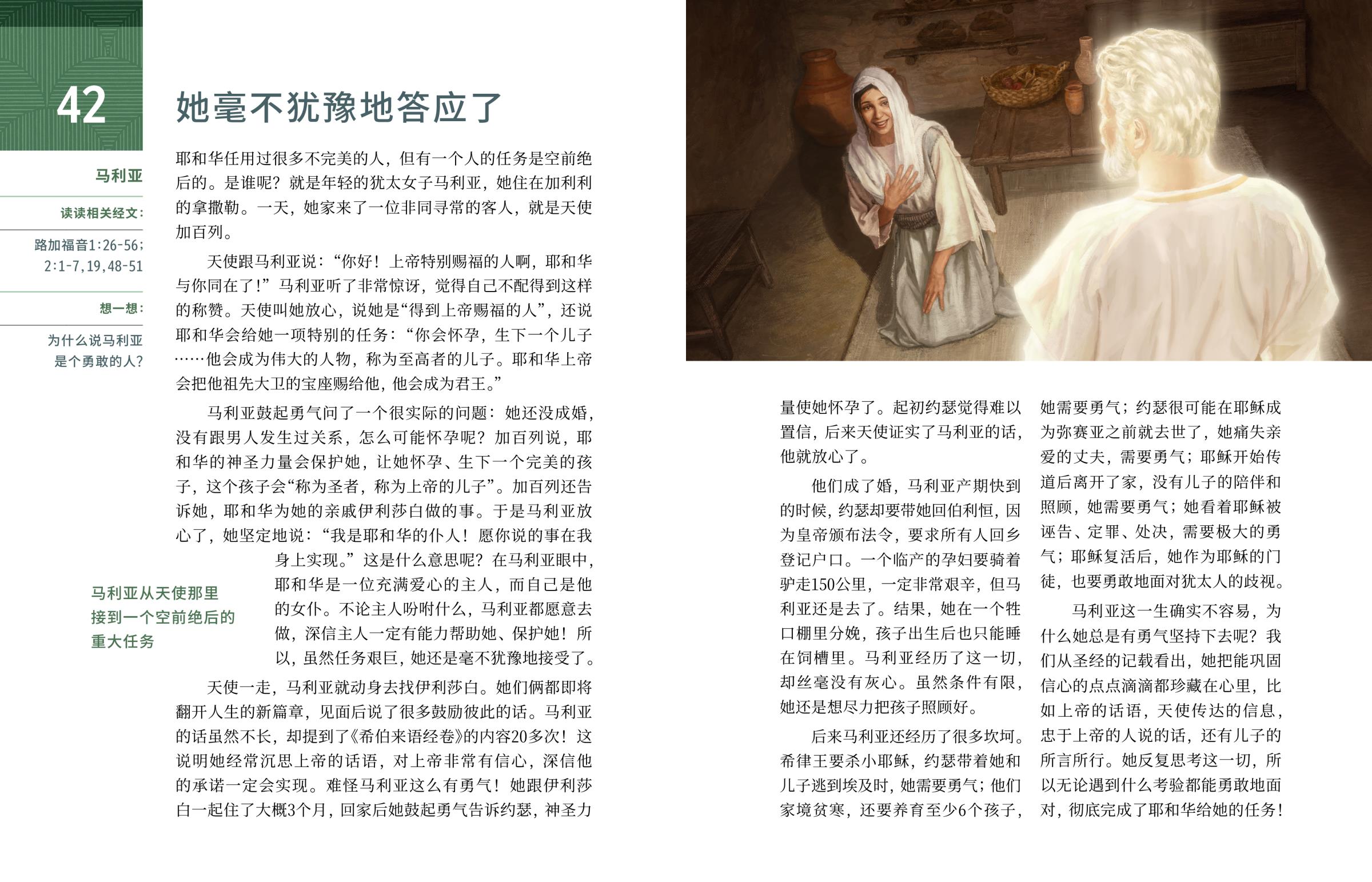 马利亚鼓起勇气问了一个很实际的问题:她还没成婚,没有跟男人发生过关系,怎么可能怀孕呢?加百列说,耶和华的神圣力量会保护她,让她怀孕、生下一个完美的孩子,这个孩子会“称为圣者,称为上帝的儿子”。加百列还告诉她,耶和华为她的亲戚伊利莎白做的事。于是马利亚放心了,她坚定地说:“我是耶和华的仆人!愿你说的事在我身上实现。”这是什么意思呢?在马利亚眼中,耶和华是一位充满爱心的主人,而自己是他的女仆。不论主人吩咐什么,马利亚都愿意去做,深信主人一定有能力帮助她、保护她!所以,虽然任务艰巨,她还是毫不犹豫地接受了。