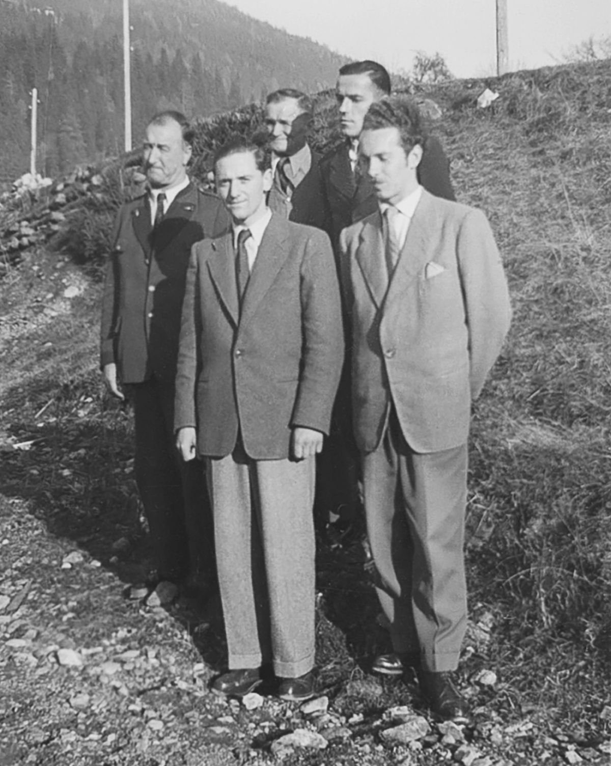 于尔根·郎德尔(左前)跟奥地利德劳河畔施皮塔尔会众的弟兄合影,摄于1954年