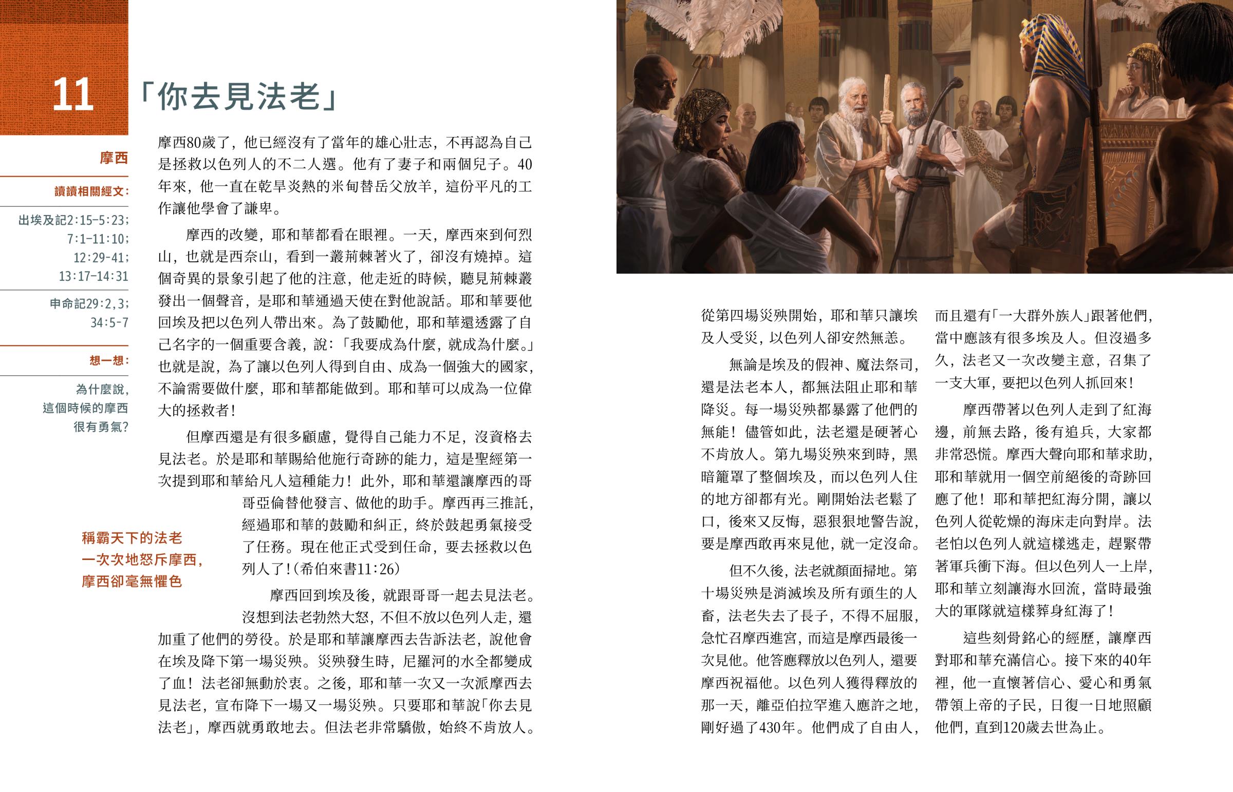 摩西回到埃及後,就跟哥哥一起去見法老。沒想到法老勃然大怒,不但不放以色列人走,還加重了他們的勞役。於是耶和華讓摩西去告訴法老,說他會在埃及降下第一場災殃。災殃發生時,尼羅河的水全都變成了血!法老卻無動於衷。之後,耶和華一次又一次派摩西去見法老,宣布降下一場又一場災殃。只要耶和華說「你去見法老」,摩西就勇敢地去。但法老非常驕傲,始終不肯放人。從第四場災殃開始,耶和華只讓埃及人受災,以色列人卻安然無恙。