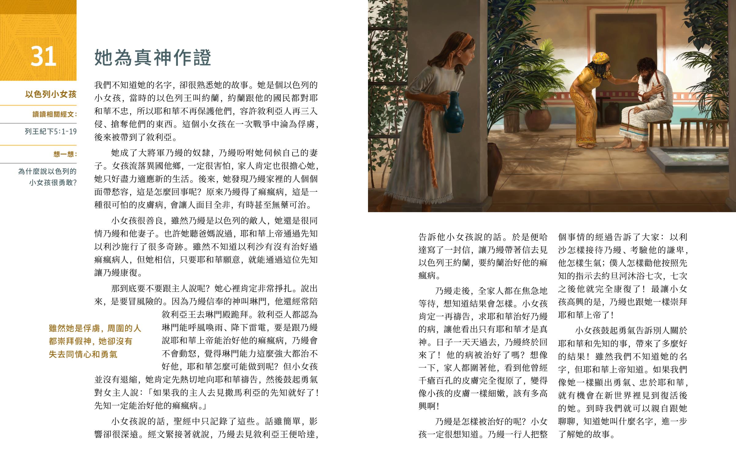 我們不知道她的名字,卻很熟悉她的故事。她是個以色列的小女孩,當時的以色列王叫約蘭,約蘭跟他的國民都對耶和華不忠,所以耶和華不再保護他們,容許敘利亞人再三入侵、搶奪他們的東西。這個小女孩在一次戰爭中淪為俘虜,後來被帶到了敘利亞。