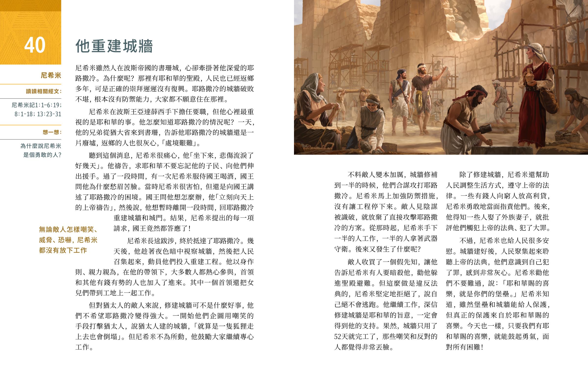 尼希米長途跋涉,終於抵達了耶路撒冷。幾天後,他趁著夜色暗中視察城牆,然後把人民召集起來,動員他們投入重建工程。他以身作則、親力親為,在他的帶領下,大多數人都熱心參與,首領和其他有錢有勢的人也加入了進來。其中一個首領還把女兒們帶到工地上一起工作。