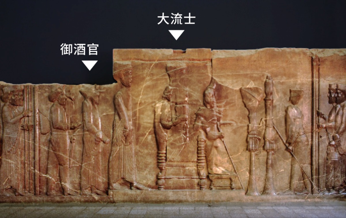 圖A:一塊古代的波斯浮雕:亞達薛西的爺爺大流士大帝和他的御酒官