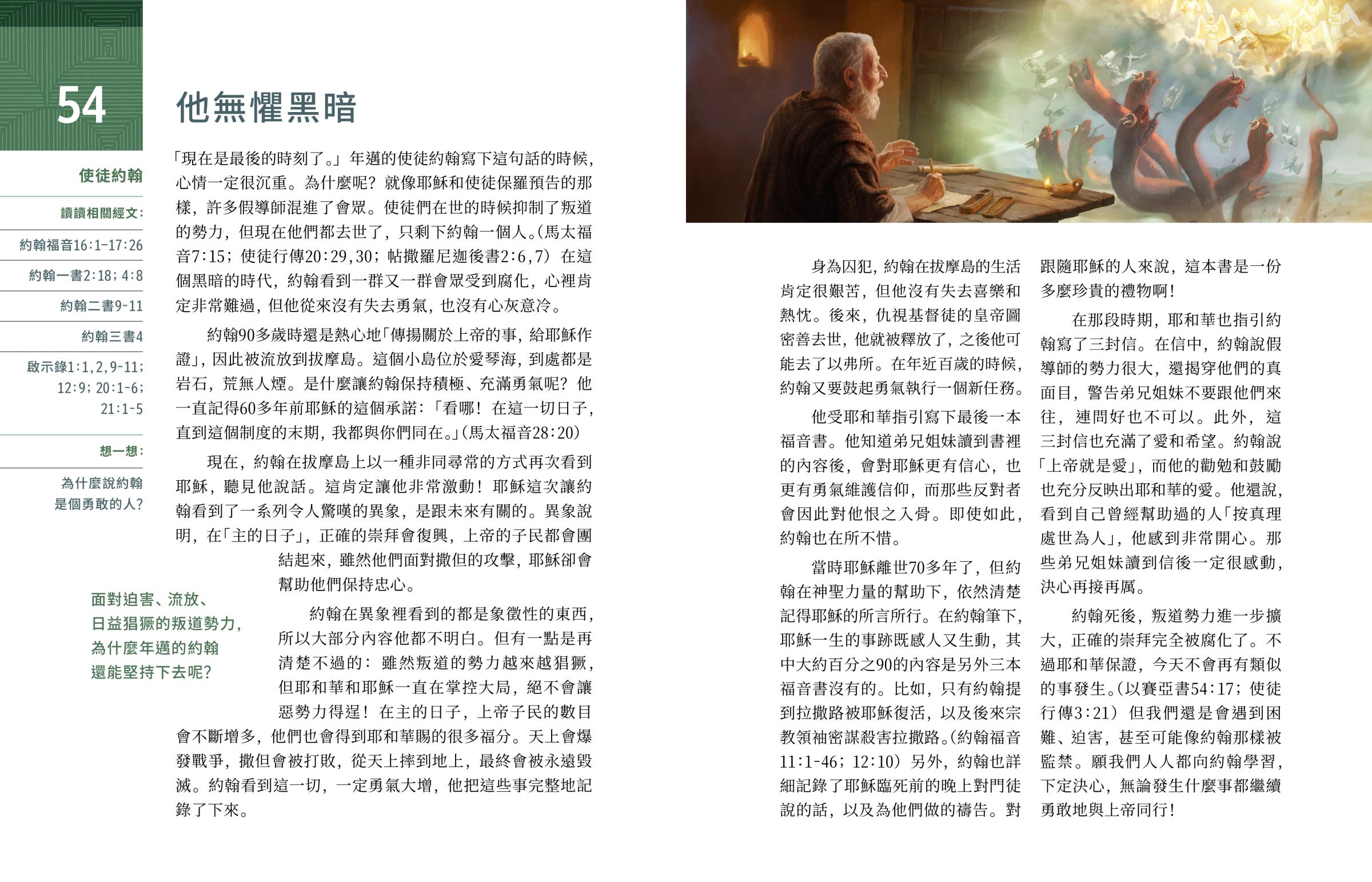 他受耶和華指引寫下最後一本福音書。他知道弟兄姐妹讀到書裡的內容後,會對耶穌更有信心,也更有勇氣維護信仰,而那些反對者會因此對他恨之入骨。即使如此,約翰也在所不惜。