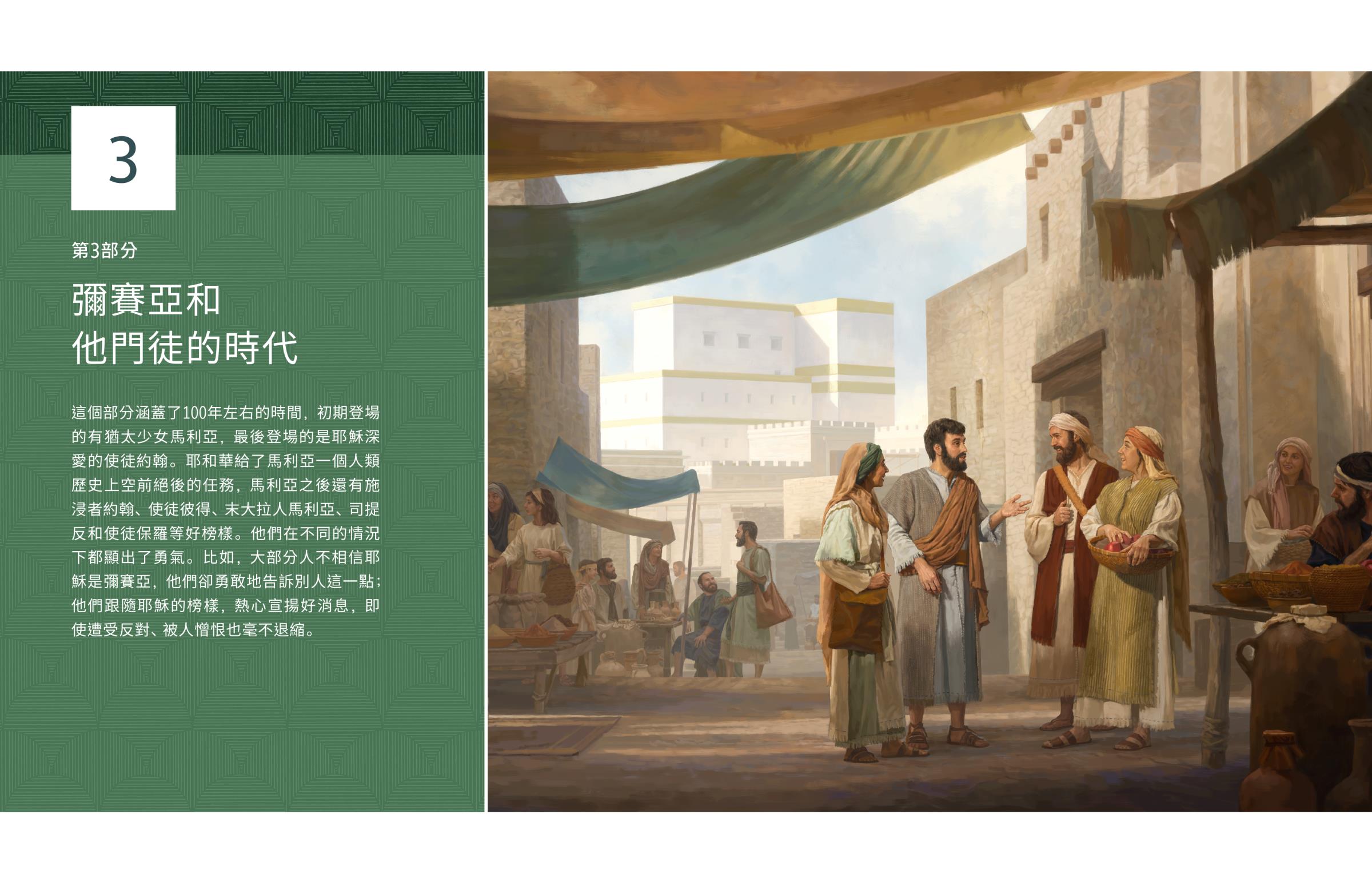 這個部分涵蓋了100年左右的時間,初期登場的有猶太少女馬利亞,最後登場的是耶穌深愛的使徒約翰。耶和華給了馬利亞一個人類歷史上空前絕後的任務,馬利亞之後還有施浸者約翰、使徒彼得、末大拉人馬利亞、司提反和使徒保羅等好榜樣。他們在不同的情況下都顯出了勇氣。比如,大部分人不相信耶穌是彌賽亞,他們卻勇敢地告訴別人這一點;他們跟隨耶穌的榜樣,熱心宣揚好消息,即使遭受反對、被人憎恨也毫不退縮。