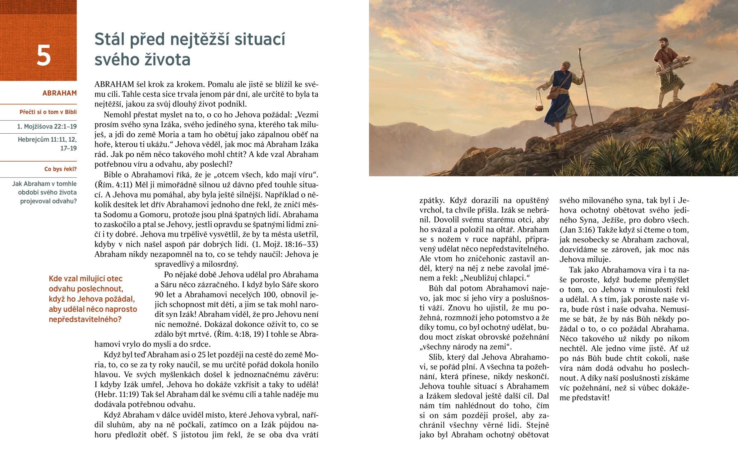 Tak jako Abrahamova víra i ta naše poroste, když budeme přemýšlet o tom, co Jehova v minulosti řekl a udělal. A s tím, jak poroste naše víra, bude růst i naše odvaha. Nemusíme se bát, že by nás Bůh někdy požádal o to, o co požádal Abrahama. Něco takového už nikdy po nikom nechtěl. Ale jedno víme jistě. Ať už po nás Bůh bude chtít cokoli, naše víra nám dodá odvahu ho poslechnout. A díky naší poslušnosti získáme víc požehnání, než si vůbec dokážeme představit!