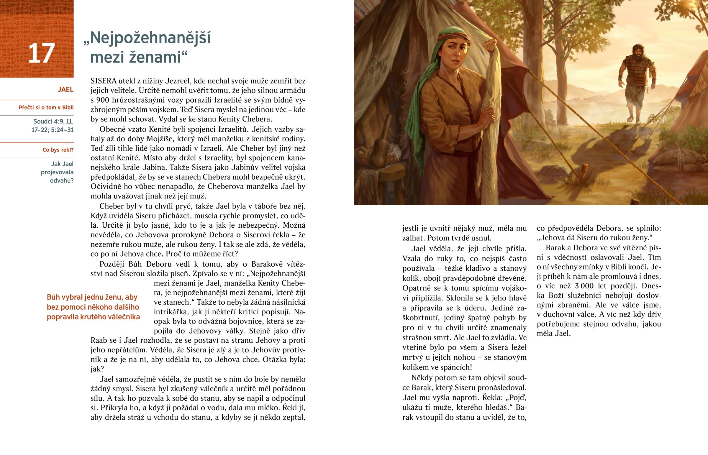 Později Bůh Deboru vedl k tomu, aby o Barakově vítězství nad Siserou složila píseň. Zpívalo se v ní: „Nejpožehnanější mezi ženami je Jael, manželka Kenity Chebera, je nejpožehnanější mezi ženami, které žijí ve stanech.“ Takže to nebyla žádná násilnická intrikářka, jak ji někteří kritici popisují. Naopak byla to odvážná bojovnice, která se zapojila do Jehovovy války. Stejně jako dřív Raab se i Jael rozhodla, že se postaví na stranu Jehovy a proti jeho nepřátelům. Věděla, že Sisera je zlý a je to Jehovův protivník a že je na ní, aby udělala to, co Jehova chce. Otázka byla: jak?