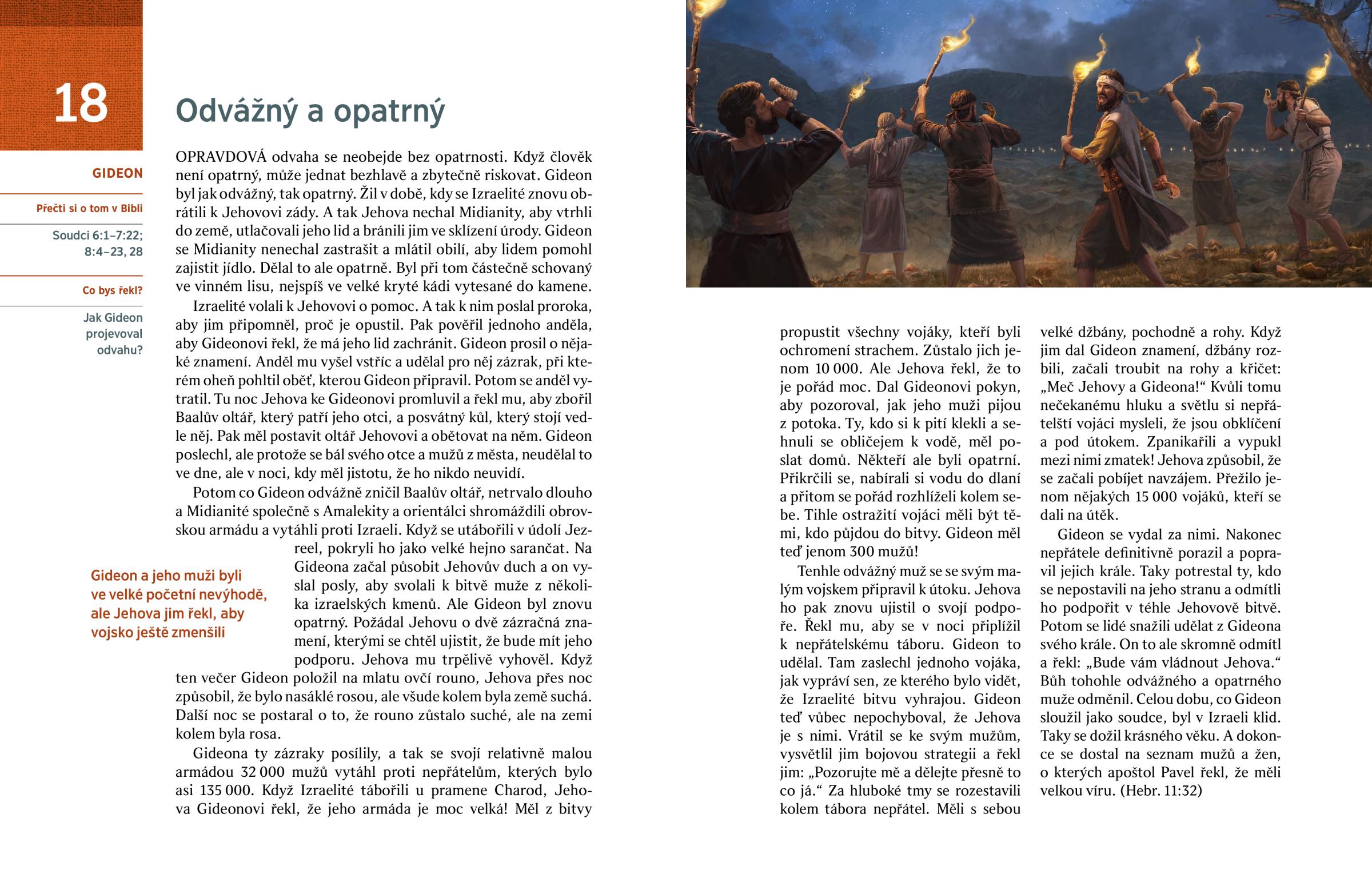 Gideon se vydal za nimi. Nakonec nepřátele definitivně porazil a popravil jejich krále. Taky potrestal ty, kdo se nepostavili na jeho stranu a odmítli ho podpořit v téhle Jehovově bitvě. Potom se lidé snažili udělat z Gideona svého krále. On to ale skromně odmítl a řekl: „Bude vám vládnout Jehova.“ Bůh tohohle odvážného a opatrného muže odměnil. Celou dobu, co Gideon sloužil jako soudce, byl v Izraeli klid. Taky se dožil krásného věku. A dokonce se dostal na seznam mužů a žen, o kterých apoštol Pavel řekl, že měli velkou víru. (Hebr. 11:32)