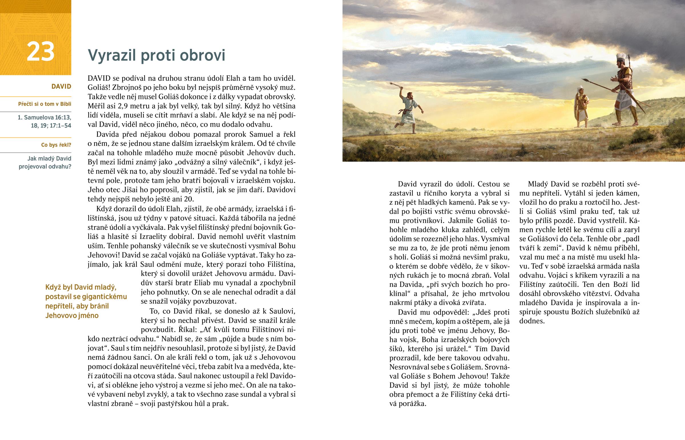 Když dorazil do údolí Elah, zjistil, že obě armády, izraelská i filištínská, jsou už týdny v patové situaci. Každá tábořila na jedné straně údolí a vyčkávala. Pak vyšel filištínský přední bojovník Goliáš a hlasitě si Izraelity dobíral. David nemohl uvěřit vlastním uším. Tenhle pohanský válečník se ve skutečnosti vysmíval Bohu Jehovovi! David se začal vojáků na Goliáše vyptávat. Taky ho zajímalo, jak král Saul odmění muže, který porazí toho Filištína, který si dovolil urážet Jehovovu armádu. Davidův starší bratr Eliab mu vynadal a zpochybnil jeho pohnutky. On se ale nenechal odradit a dál se snažil vojáky povzbuzovat.