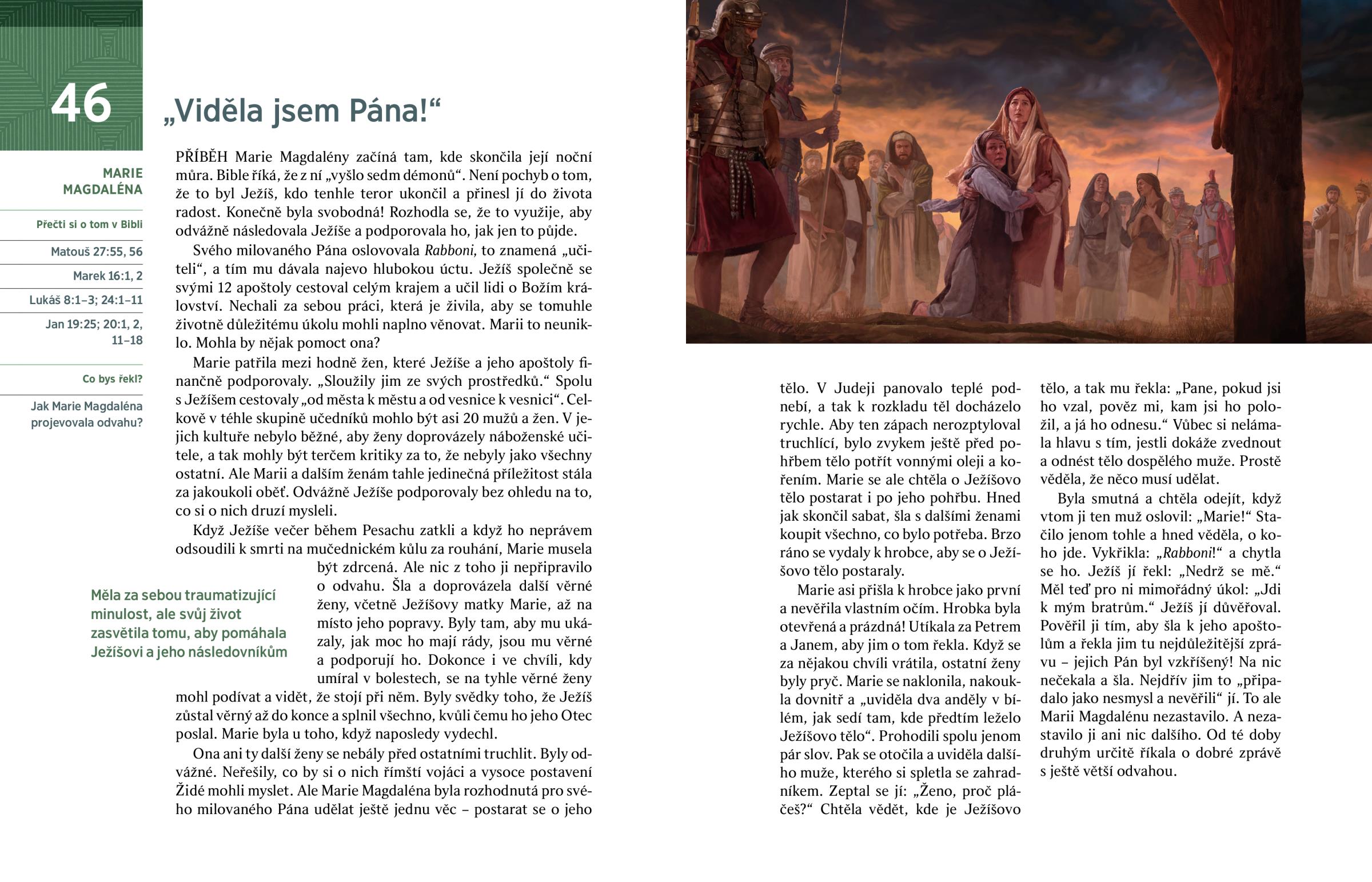 Byla smutná a chtěla odejít, když vtom ji ten muž oslovil: „Marie!“ Stačilo jenom tohle a hned věděla, o koho jde. Vykřikla: „Rabboni!“ a chytla se ho. Ježíš jí řekl: „Nedrž se mě.“ Měl teď pro ni mimořádný úkol: „Jdi k mým bratrům.“ Ježíš jí důvěřoval. Pověřil ji tím, aby šla k jeho apoštolům a řekla jim tu nejdůležitější zprávu – jejich Pán byl vzkříšený! Na nic nečekala a šla. Nejdřív jim to „připadalo jako nesmysl a nevěřili“ jí. To ale Marii Magdalénu nezastavilo. A nezastavilo ji ani nic dalšího. Od té doby druhým určitě říkala o dobré zprávě s ještě větší odvahou.