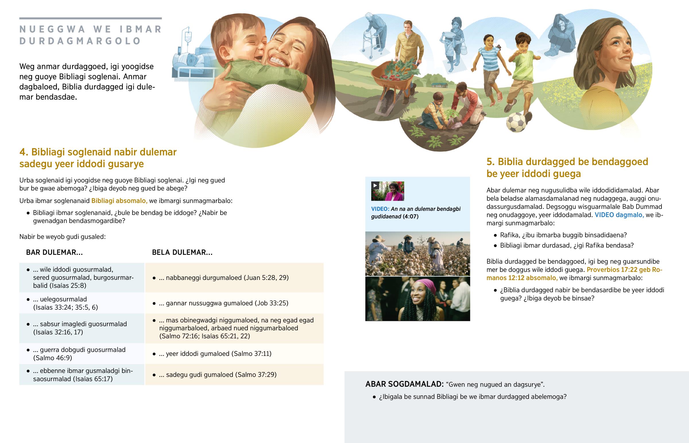 Bibliagi soglenaid, ibiga bela beladse neg gagales gunai. Soglenabalid, weyob neg isgunai gadeguosurye, isse nabye neg nuguega. Degsoggu, Biblia durdagged nabir be bendasmogaled “yooedse be yeer iddodi” guega (Jeremías 29:11, 12 absogo). Amba nabir be bendasbaliled emi ibagi be yeer iddodi gubaliga. Bibliagi soglenabalid, yoogidse dulemar sadegu yeer iddodi guoye.