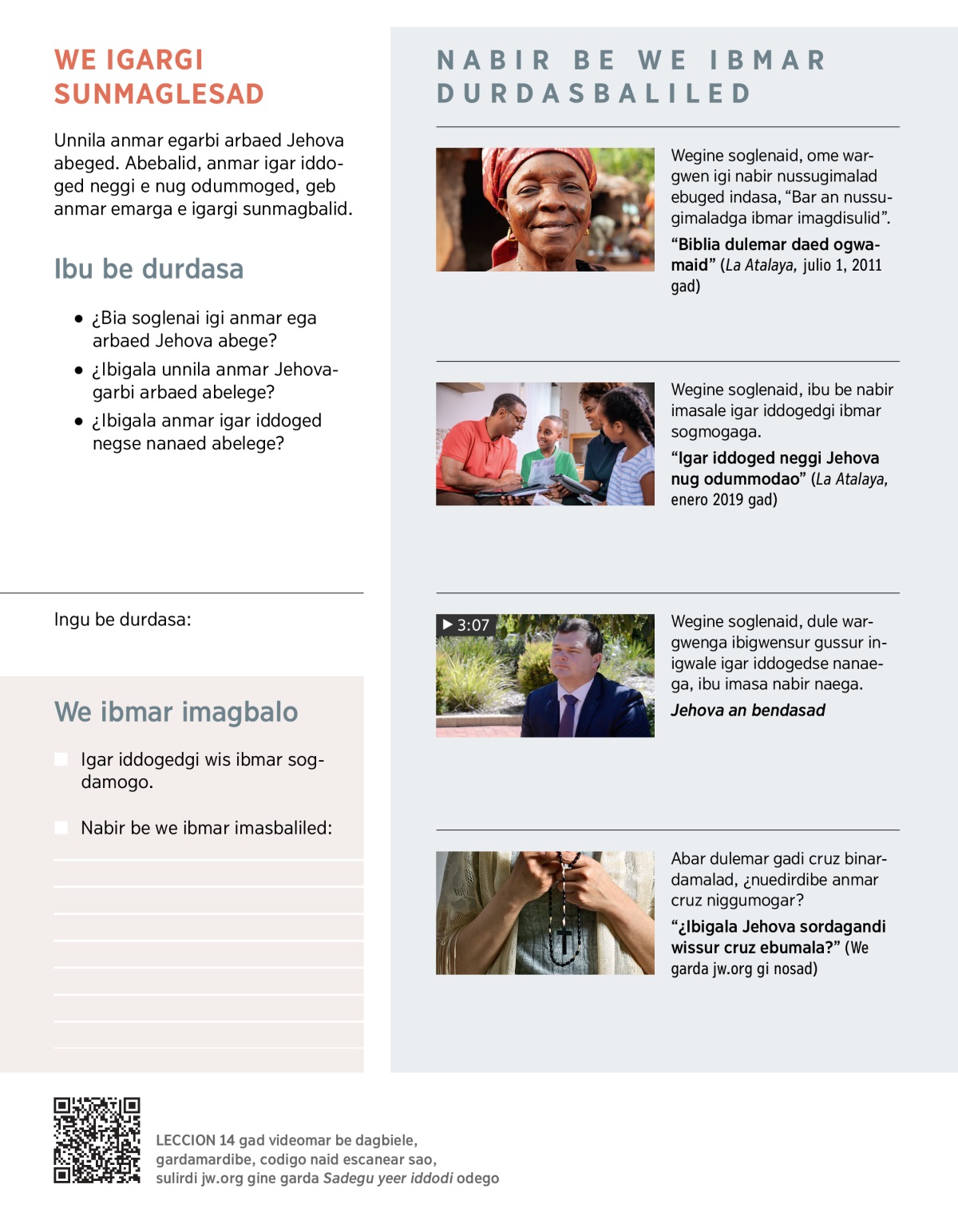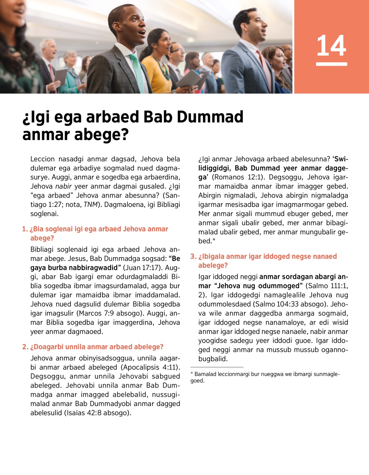 Leccion nasadgi anmar dagsad, Jehova bela dulemar ega arbadiye sogmalad nued dagmasurye. Auggi, anmar e sogedba ega arbaerdina, Jehova nabir yeer anmar dagmai gusaled. ¿Igi “ega arbaed” Jehova anmar abesunna? (Santiago 1:27; nota, TNM). Dagmaloena, igi Bibliagi soglenai.
