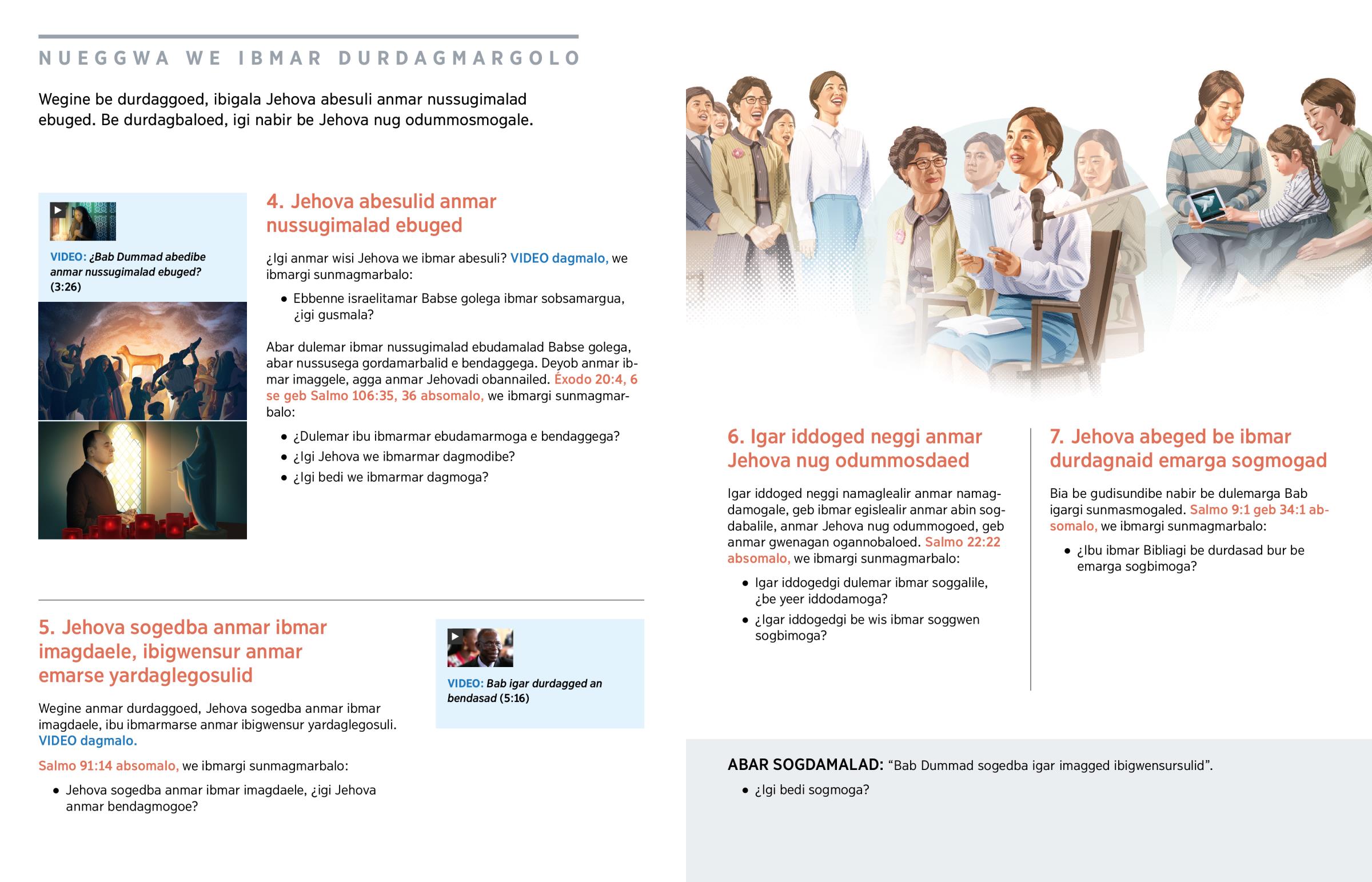 ¿Igi anmar Jehovaga arbaed abelesunna? ‘Swilidiggidgi, Bab Dummad yeer anmar daggega’ (Romanos 12:1). Degsoggu, Jehova igarmar mamaidba anmar ibmar imagger gebed. Abirgin nigmaladi, Jehova abirgin nigmaladga igarmar mesisadba igar imagmarmogar gebed. Mer anmar sigali mummud ebuger gebed, mer anmar sigali ubalir gebed, mer anmar bibagimalad ubalir gebed, mer anmar mungubalir gebed.a