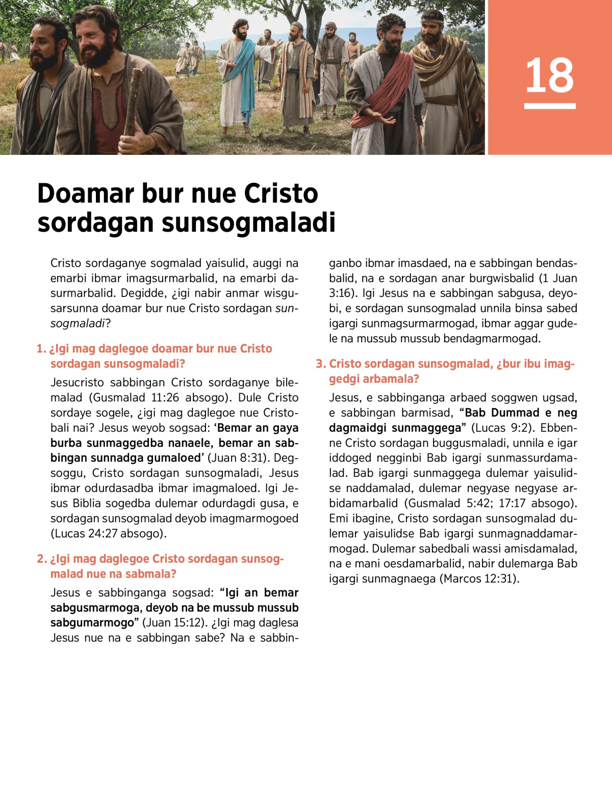 Jesucristo sabbingan Cristo sordaganye bilemalad (Gusmalad 11:26 absogo). Dule Cristo sordaye sogele, ¿igi mag daglegoe nue Cristobali nai? Jesus weyob sogsad: ‘Bemar an gaya burba sunmaggedba nanaele, bemar an sabbingan sunnadga gumaloed’ (Juan 8:31). Degsoggu, Cristo sordagan sunsogmaladi, Jesus ibmar odurdasadba ibmar imagmaloed. Igi Jesus Biblia sogedba dulemar odurdagdi gusa, e sordagan sunsogmalad deyob imagmarmogoed (Lucas 24:27 absogo).