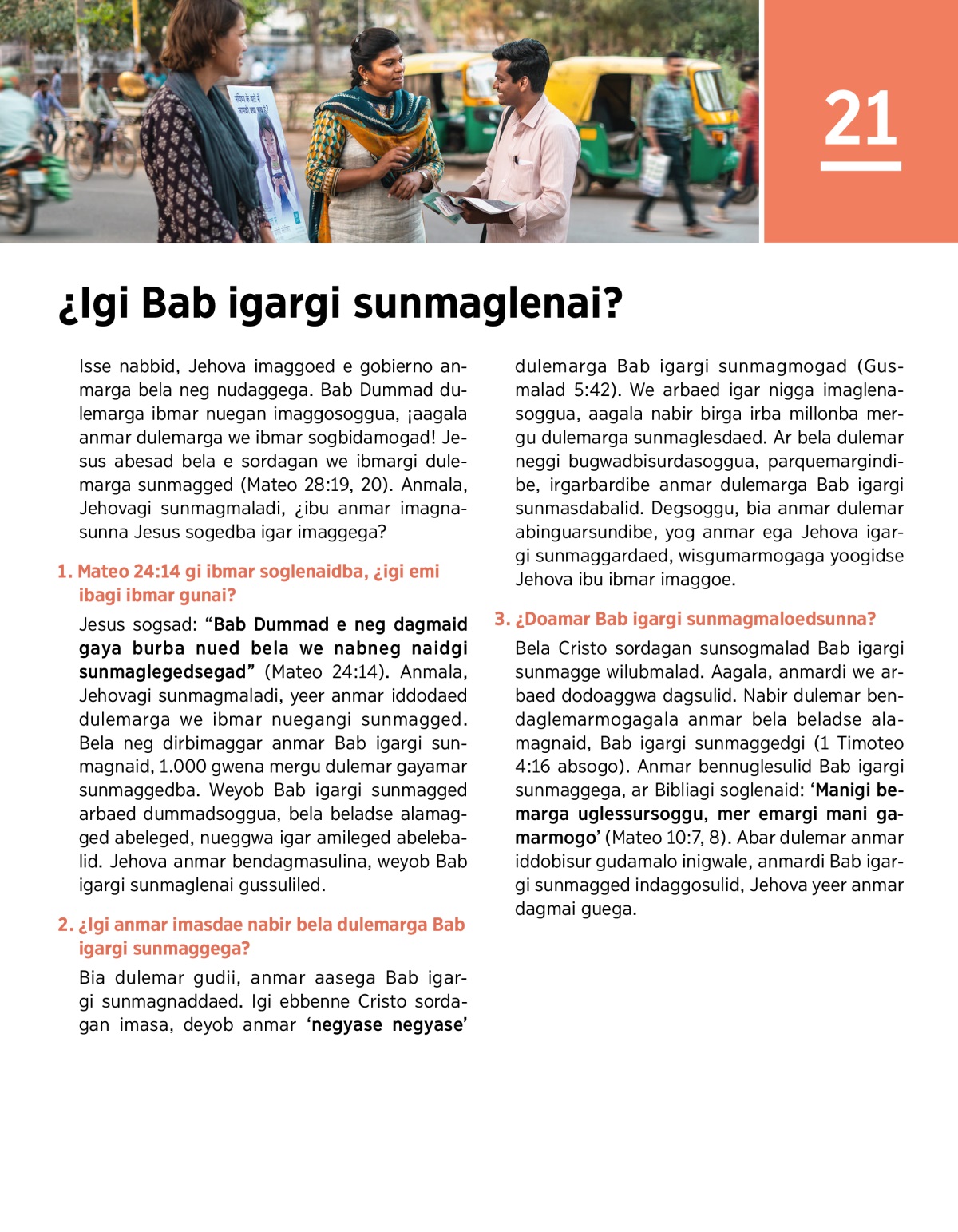 Bela Cristo sordagan sunsogmalad Bab igargi sunmagge wilubmalad. Aagala, anmardi we arbaed dodoaggwa dagsulid. Nabir dulemar bendaglemarmogagala anmar bela beladse alamagnaid, Bab igargi sunmaggedgi (1 Timoteo 4:16 absogo). Anmar bennuglesulid Bab igargi sunmaggega, ar Bibliagi soglenaid: ‘Manigi bemarga uglessursoggu, mer emargi mani gamarmogo’ (Mateo 10:​7, 8). Abar dulemar anmar iddobisur gudamalo inigwale, anmardi Bab igargi sunmagged indaggosulid, Jehova yeer anmar dagmai guega.