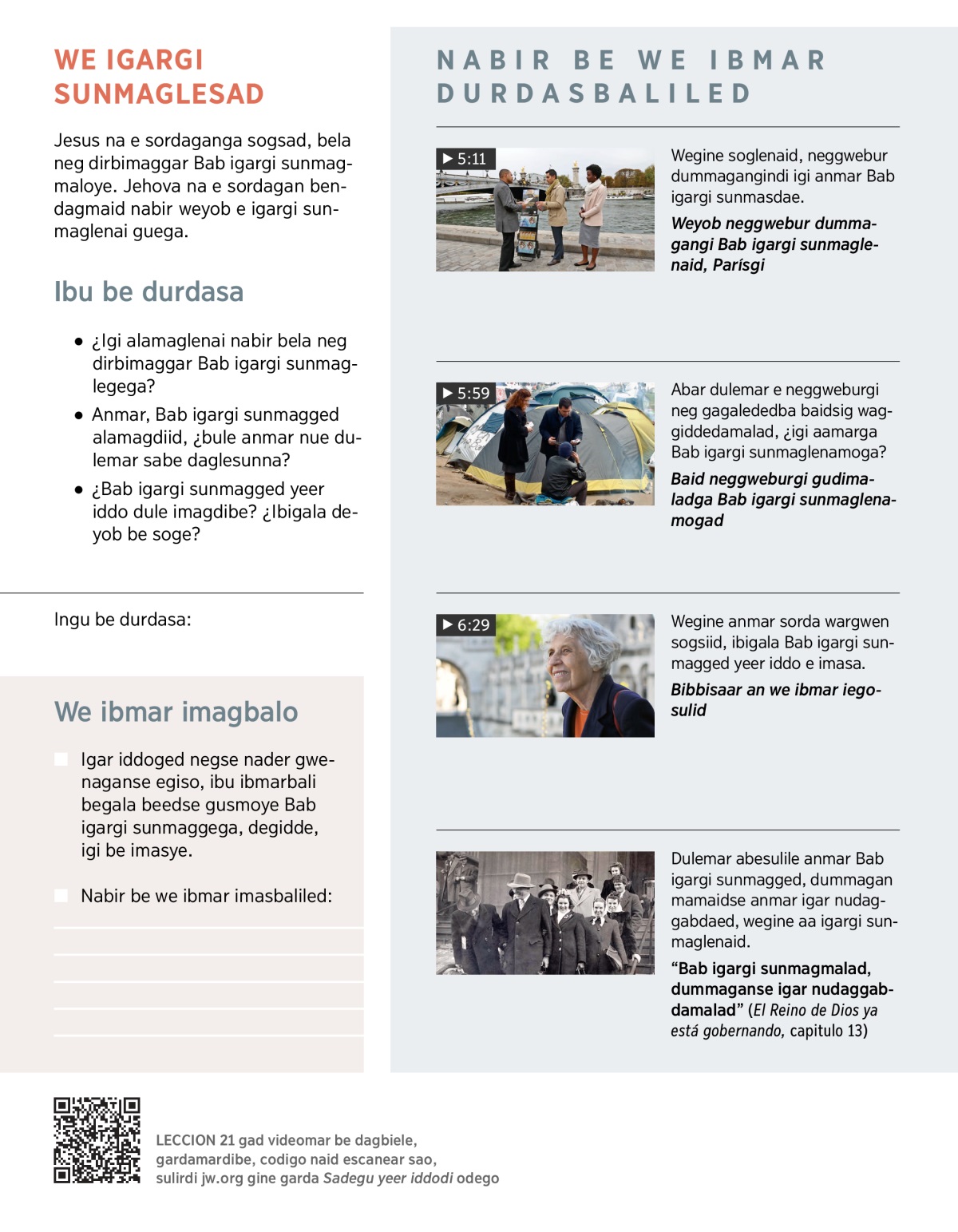 Jesus sogsad: “Bab Dummad e neg dagmaid gaya burba nued bela we nabneg naidgi sunmaglegedsegad” (Mateo 24:14). Anmala, Jehovagi sunmagmaladi, yeer anmar iddodaed dulemarga we ibmar nuegangi sunmagged. Bela neg dirbimaggar anmar Bab igargi sunmagnaid, 1.000 gwena mergu dulemar gayamar sunmaggedba. Weyob Bab igargi sunmagged arbaed dummadsoggua, bela beladse alamagged abeleged, nueggwa igar amileged abelebalid. Jehova anmar bendagmasulina, weyob Bab igargi sunmaglenai gussuliled.