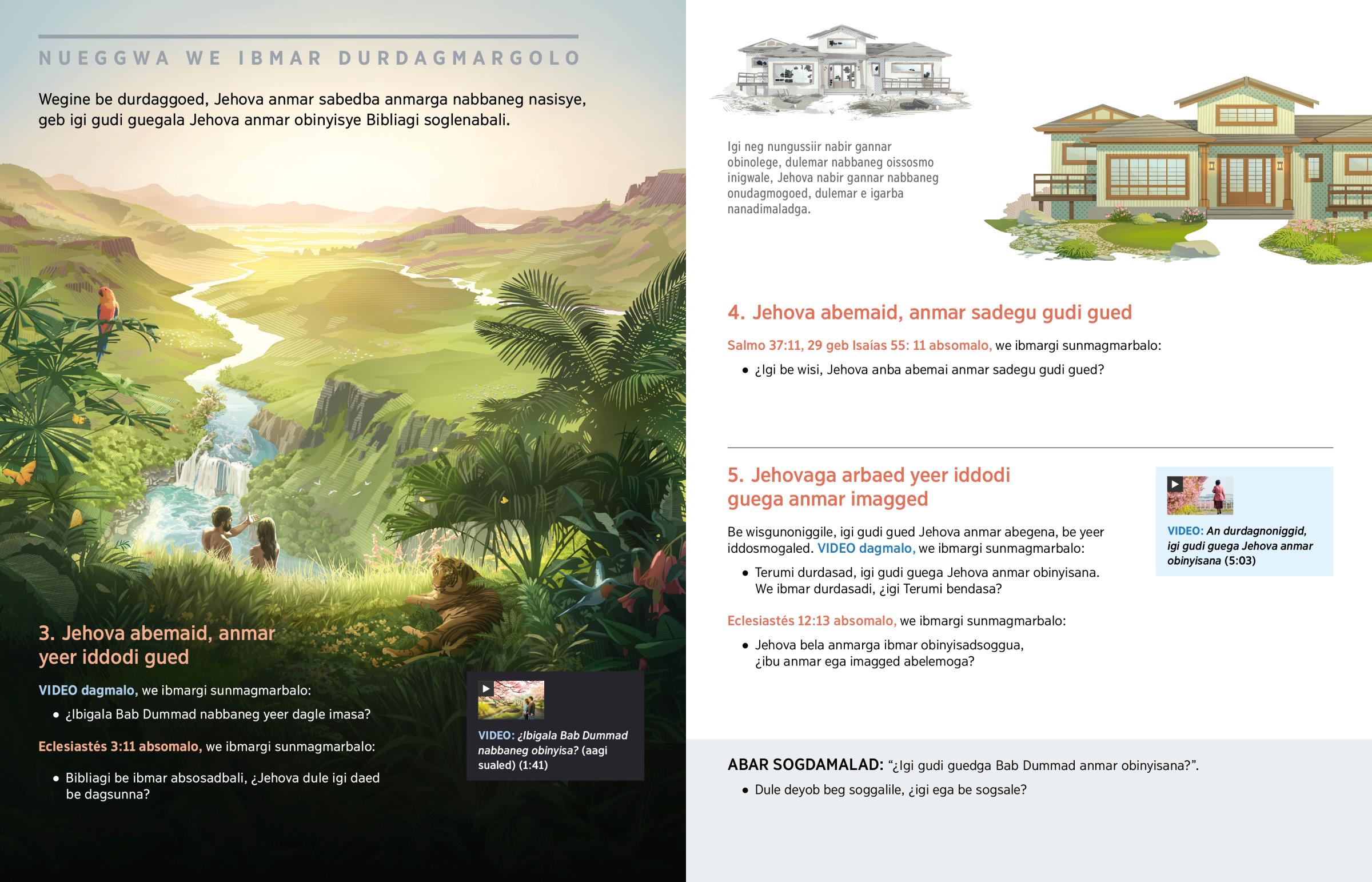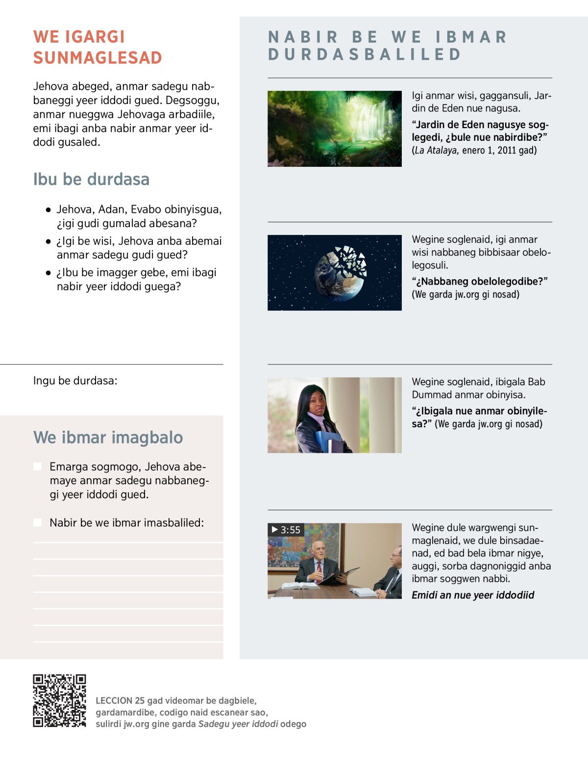 Jehova abeged anmar yeer iddodi gued. Aagala, gebbe dulemar obinyisgua, Adan, Evabo, neg yeer daglegedgi ogwissisad, Edengi. Aagine, ‘Bab Dummad we dulemargi ise nued binsasadba, ega sogded: Bemar mimmigan buggidar niggumar. We nabneggi dula buggidar urbemar, degi, bela we nabneg ugaggase ambiggumar. Bemar we nabneggi, bela ibdurganmargi obindi gumarsun’ (Génesis 1:28). Degsoggu, Jehova abesanad, Adan, Evabogwa, buggidar mimmigan niggumalad, bela nabbaneg yeer dagle imagmalad, geb ibmar durgan aggwedi gumarbalid. Jehova abesanad, dulemar sadegu gudi gued, abessulinad, dulemar boniganba gaedi gued.