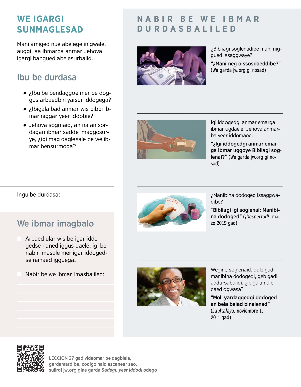 Bibliagi soglenai inigwale, ‘mani niggued anmar bendaggoye’, auggi soglenabalid, mani undar yeer iddodi guega anmar imaggosurye (Eclesiastés 7:12). Aagala, Bibliagi anmarga soglenaid, mer doggus manibin iddomaloye. Bur soglenaid: “Na emi be ibmar niggadgi be yeer iddodi gumarye” (Hebreos 13:5 absogo). Anmar wis bad bibbi ibmar niggar yeer iddodaele, doggus anmar ibmar bamalad amiedgi binsadiosulid. Degiile, binsasun anmar emargi mani gaosurbalid (Proverbios 22:7). Anmar manibin dododii guosurbalid. Gwae gwae mani abegedba anmar ibmar uggiar mani ibedga dule imagmaladse binsaed galegosurbalid.