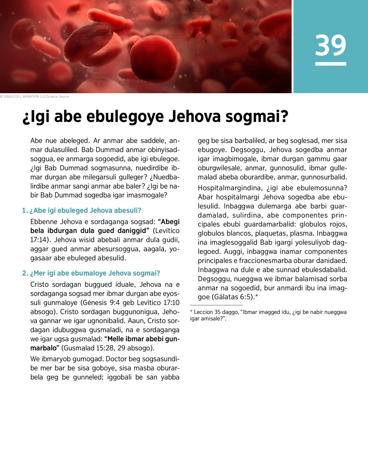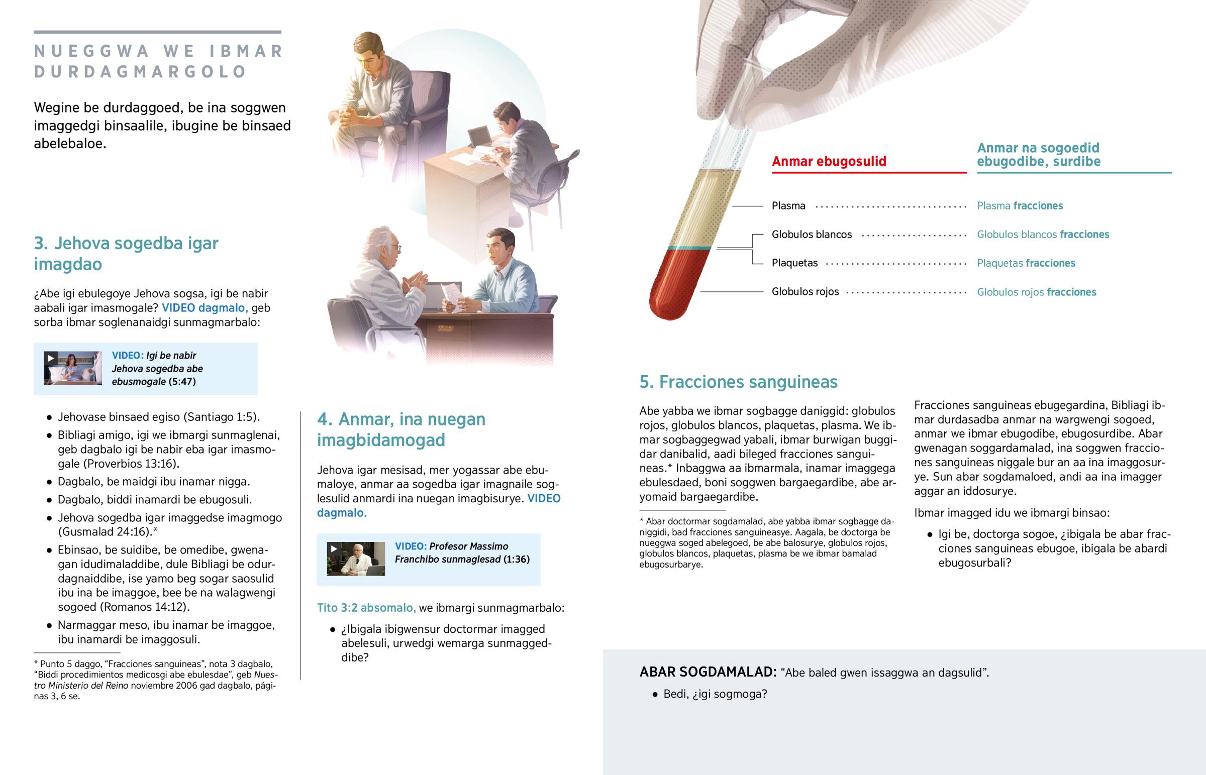 Hospitalmargindina, ¿igi abe ebulemosunna? Abar hospitalmargi Jehova sogedba abe ebulesulid. Inbaggwa dulemarga abe barbi guardamalad, sulirdina, abe componentes principales ebubi guardamarbalid: globulos rojos, globulos blancos, plaquetas, plasma. Inbaggwa ina imaglesoggalid Bab igargi yolesuliyob daglegoed. Auggi, inbaggwa inamar componentes principales e fraccionesmarba oburar danidaed. Inbaggwa na dule e abe sunnad ebulesdabalid. Degsoggu, nueggwa we ibmar balamisad sorba anmar na sogoedid, bur anmardi ibu ina imaggoe (Gálatas 6:5).a