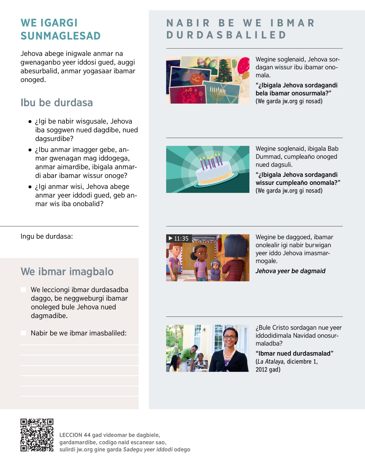 Abar ibamar Jehova sogedba onolearsurnanaed, noar Bab igar odurdagmalad we ibamar onoarmalad. Abar we ibamar niamarga onolealid, abar onolesnanabalid, dulemar obinsaega, dule burgwisale e burbadi anba dula gudidaye. Dobe ise guedba abar ibamar imaglebalid, dobe aggar guedbardibe. Aagala Jehovadi weyob na e sordaganga sogmaid: “Ibmar isgana mer ebumalo” (2 Corintios 6:17).a
