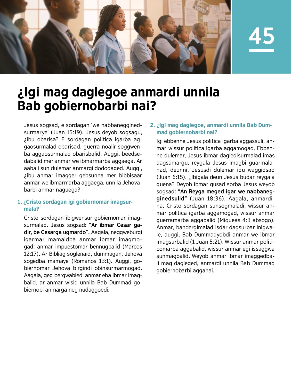 Igi ebbenne Jesus politica igarba aggassuli, anmar wissur politica igarba aggamogad. Ebbenne dulemar, Jesus ibmar dagledisurmalad imas dagsamargu, reygala Jesus imagbi guarmalanad, deunni, Jesusdi dulemar idu waggidsad (Juan 6:15). ¿Ibigala deun Jesus budar reygala guena? Deyob ibmar gusad sorba Jesus weyob sogsad: “An Reyga meged igar we nabbanegginedsulid” (Juan 18:36). Aagala, anmardina, Cristo sordagan sunsogmaladi, wissur anmar politica igarba aggamogad, wissur anmar guerramarba aggabalid (Miqueas 4:3 absogo). Anmar, bandergimalad isdar dagsurbar inigwale, auggi, Bab Dummadyobdi anmar we ibmar imagsurbalid (1 Juan 5:21). Wissur anmar politicomarba aggabalid, wissur anmar egi issaggwa sunmagbalid. Weyob anmar ibmar imaggedbali mag dagleged, anmardi unnila Bab Dummad gobiernobarbi agganai.