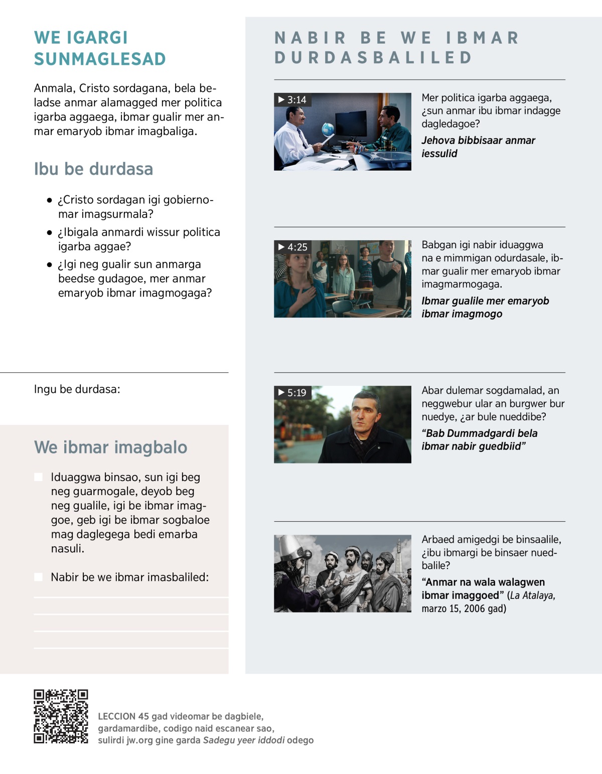 Inbaggwa gobiernomar Bab igargi yolegega anmar imagbi guardamalad. Deyob ibmar gualile, ¿doabali bur anmar igar imaggoe? Gusmalad 5:28, 29 absomalo. Sorba VIDEO dagmalo, we ibmargi sunmagmarbalo: