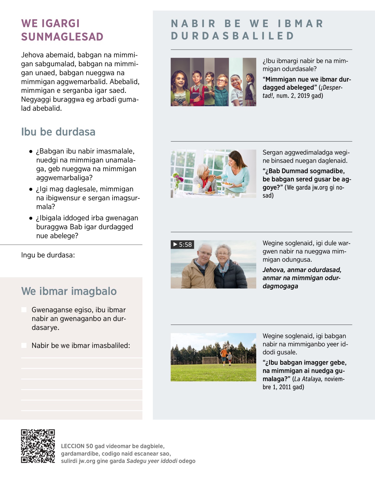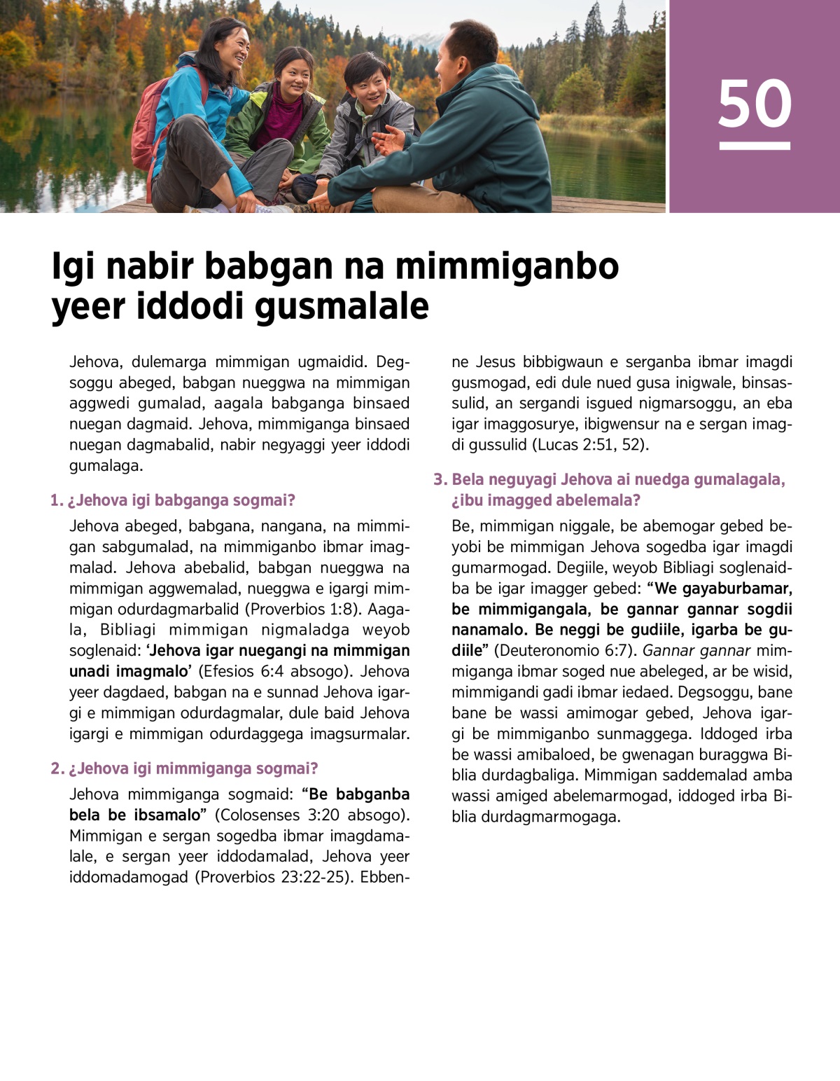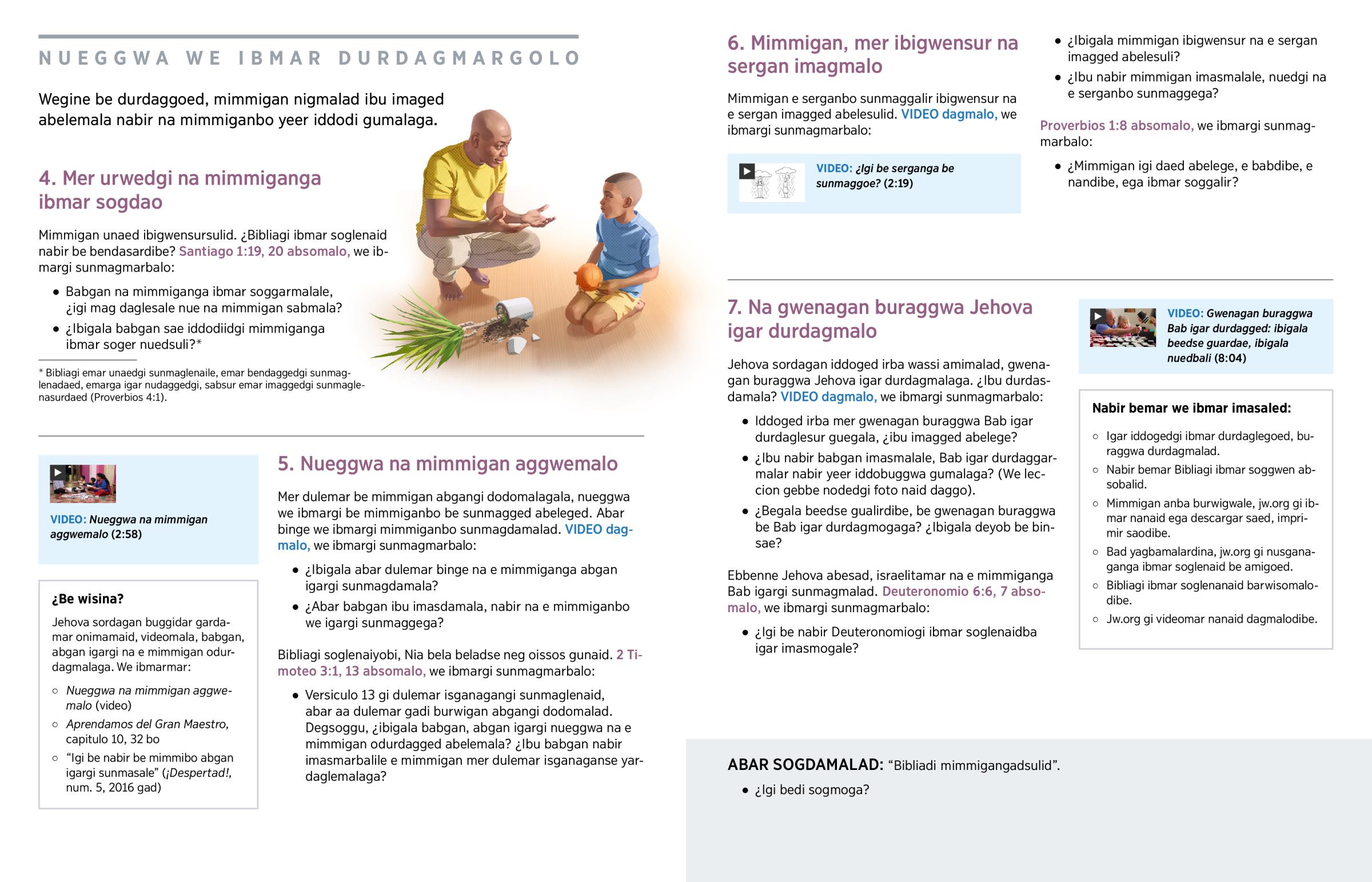 Jehova abeged, babgana, nangana, na mimmigan sabgumalad, na mimmiganbo ibmar imagmalad. Jehova abebalid, babgan nueggwa na mimmigan aggwemalad, nueggwa e igargi mimmigan odurdagmarbalid (Proverbios 1:8). Aagala, Bibliagi mimmigan nigmaladga weyob soglenaid: ‘Jehova igar nuegangi na mimmigan unadi imagmalo’ (Efesios 6:4 absogo). Jehova yeer dagdaed, babgan na e sunnad Jehova igargi e mimmigan odurdagmalar, dule baid Jehova igargi e mimmigan odurdaggega imagsurmalar.