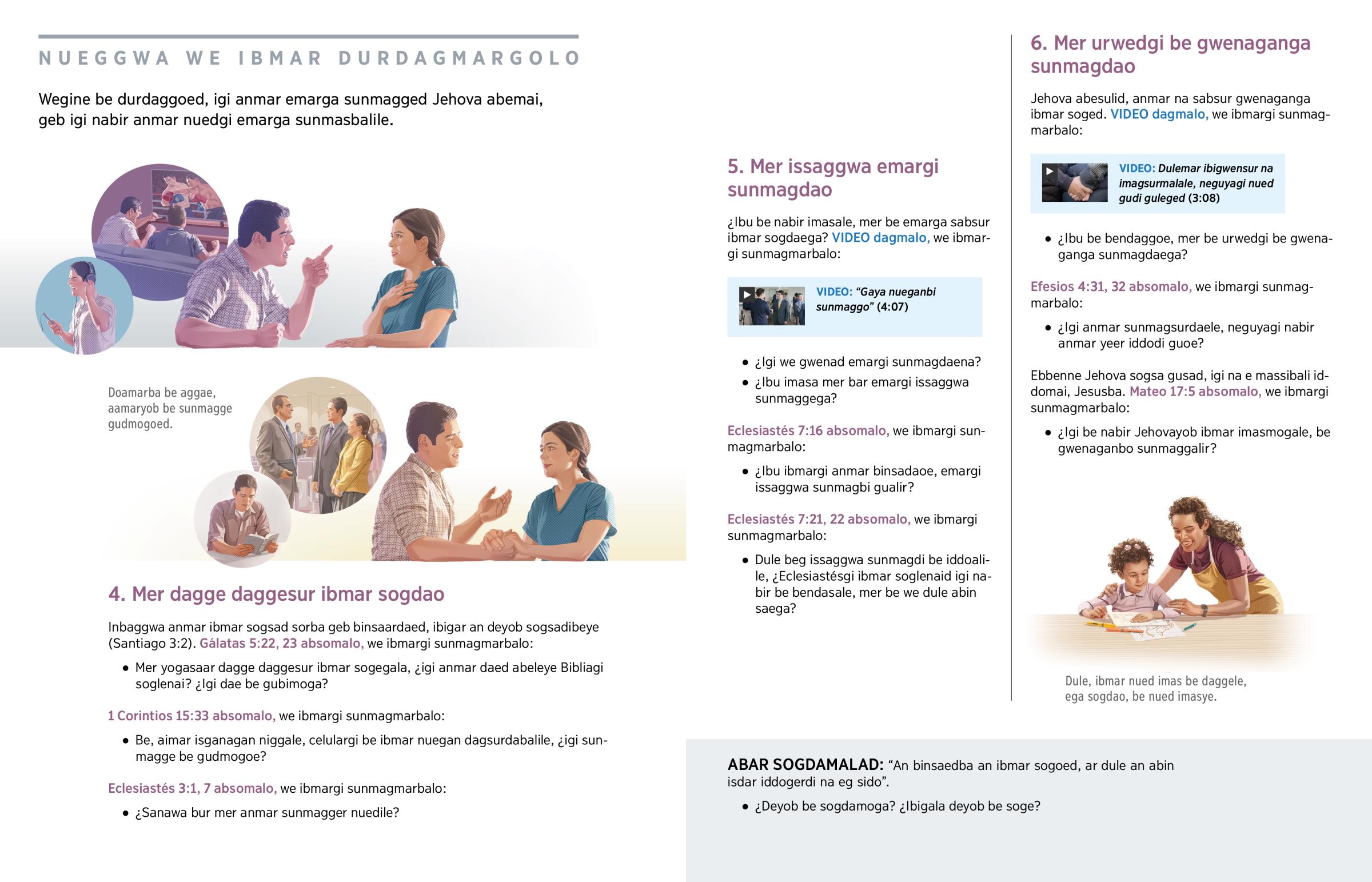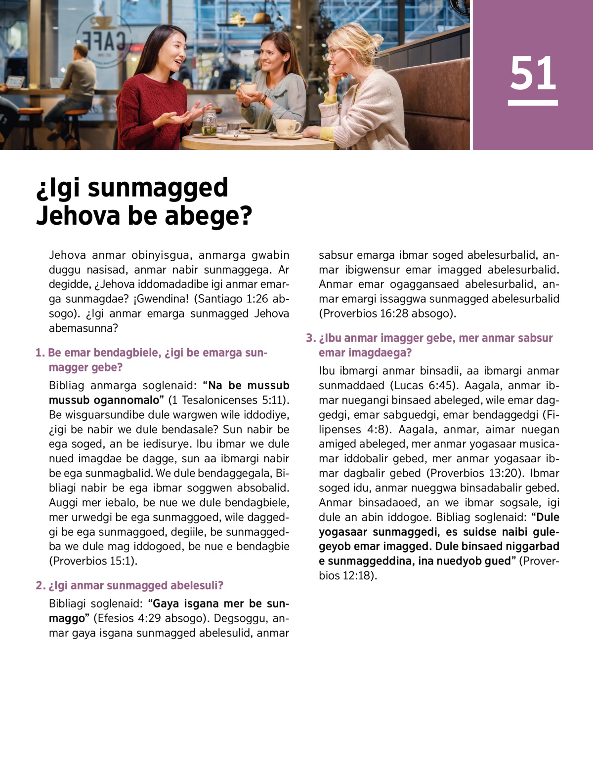Bibliag anmarga soglenaid: “Na be mussub mussub ogannomalo” (1 Tesalonicenses 5:11). Be wisguarsundibe dule wargwen wile iddodiye, ¿igi be nabir we dule bendasale? Sun nabir be ega soged, an be iedisurye. Ibu ibmar we dule nued imagdae be dagge, sun aa ibmargi nabir be ega sunmagbalid. We dule bendaggegala, Bibliagi nabir be ega ibmar soggwen absobalid. Auggi mer iebalo, be nue we dule bendagbiele, mer urwedgi be ega sunmaggoed, wile daggedgi be ega sunmaggoed, degiile, be sunmaggedba we dule mag iddogoed, be nue e bendagbie (Proverbios 15:1).