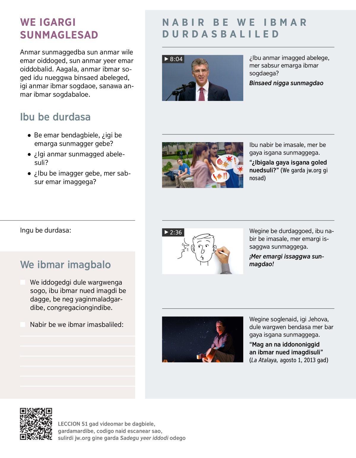Ibu ibmargi anmar binsadii, aa ibmargi anmar sunmaddaed (Lucas 6:45). Aagala, anmar ibmar nuegangi binsaed abeleged, wile emar daggedgi, emar sabguedgi, emar bendaggedgi (Filipenses 4:8). Aagala, anmar, aimar nuegan amiged abeleged, mer anmar yogasaar musicamar iddobalir gebed, mer anmar yogasaar ibmar dagbalir gebed (Proverbios 13:20). Ibmar soged idu, anmar nueggwa binsadabalir gebed. Anmar binsadaoed, an we ibmar sogsale, igi dule an abin iddogoe. Bibliag soglenaid: “Dule yogasaar sunmaggedi, es suidse naibi gulegeyob emar imagged. Dule binsaed niggarbad e sunmaggeddina, ina nuedyob gued” (Proverbios 12:18).