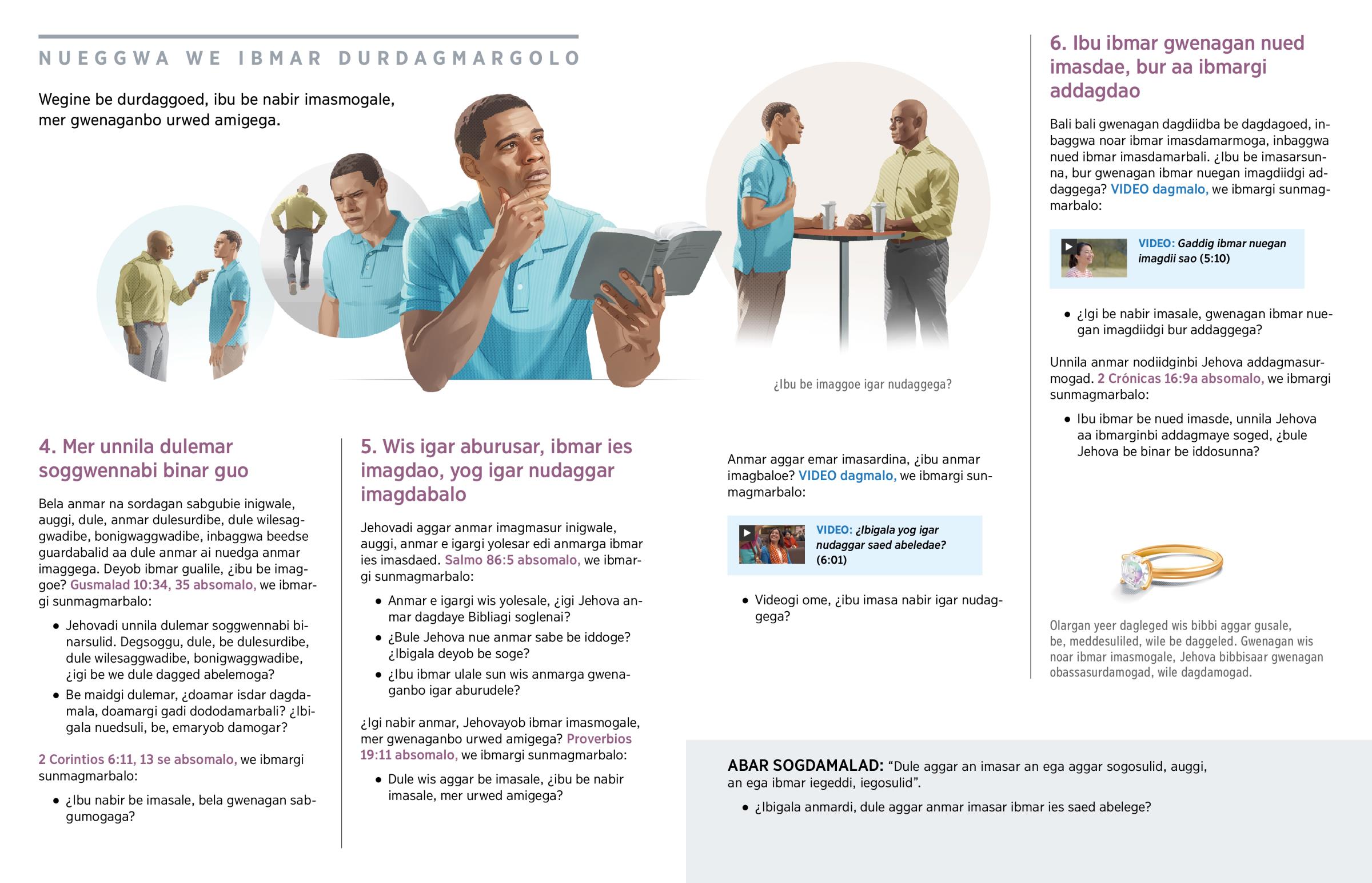 Bibliag soglenaid: “Na be mussub mussub ise nue sabguar nanamarsun” (1 Pedro 1:22). ¿Igi be nabir weg ibmar soglenaidba igar imasmogale? Wis dule aggar be imasale, mer be doggus aa ibmargi binsaer gebed, bur be we dule ibmar nuegan imagdiidgi binsadaer gebed. Mer be unnila dulemar soggwennabi be aimarga imagbalir gebed. Mer be unnila be dulemarbarbi aggabalir gebed, mer be isdar wagmar dagbalir gebed, bela emarbi be dulemar dagger gebed (1 Pedro 2:17 absogo).a