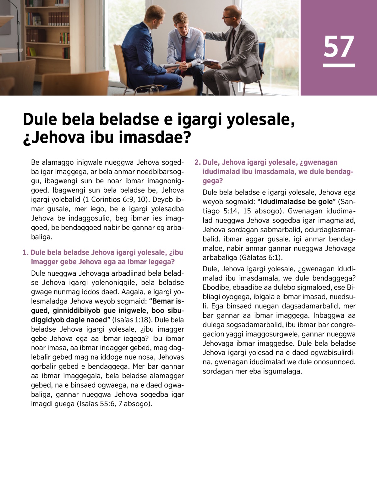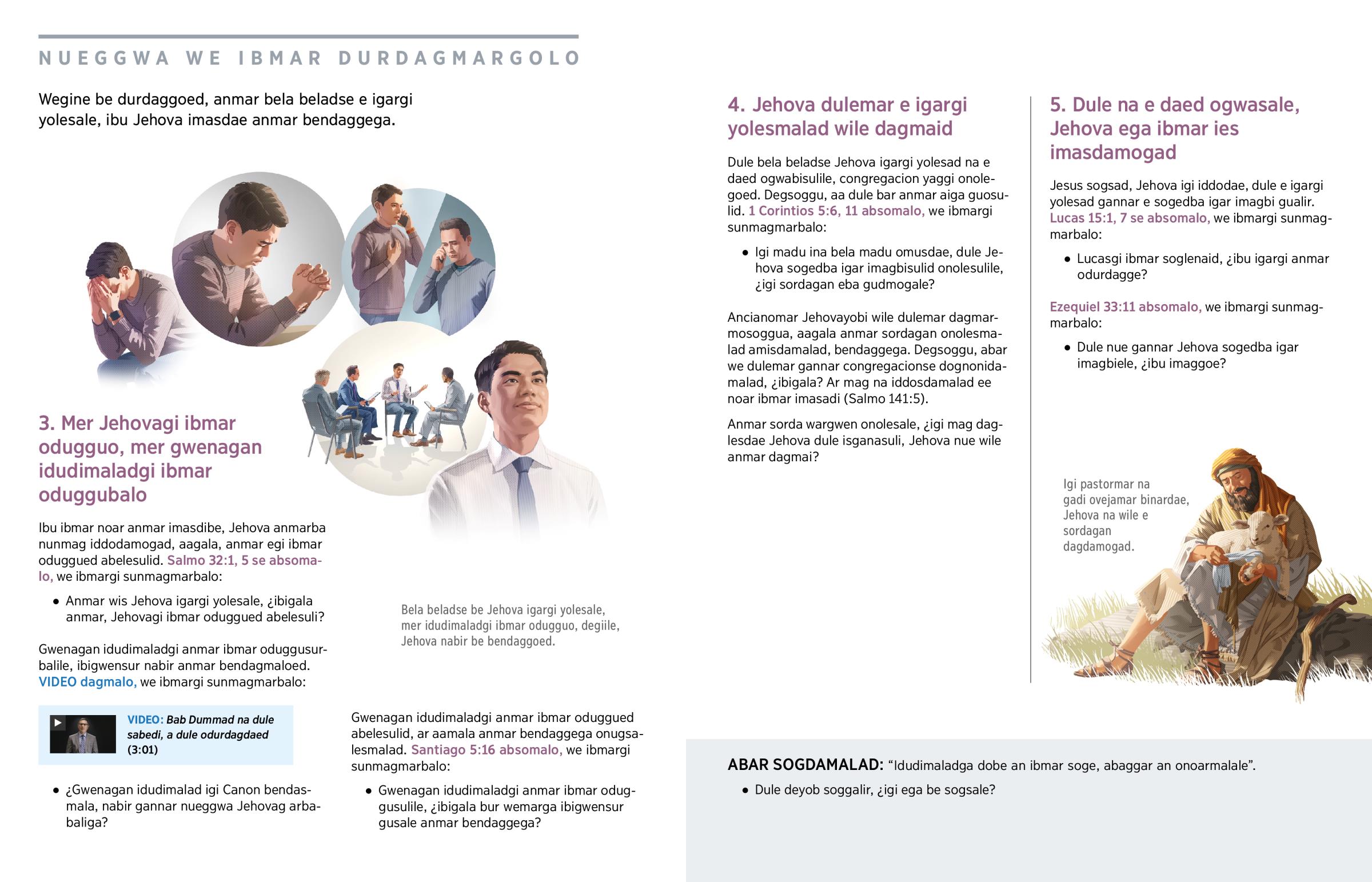 Dule, Jehova igargi yolesale, ¿gwenagan idudimalad ibu imasdamala, we dule bendaggega? Ebodibe, ebaadibe aa dulebo sigmaloed, ese Bibliagi oyogega, ibigala e ibmar imasad, nuedsuli. Ega binsaed nuegan dagsadamarbalid, mer bar gannar aa ibmar imaggega. Inbaggwa aa dulega sogsadamarbalid, ibu ibmar bar congregacion yaggi imaggosurgwele, gannar nueggwa Jehovaga ibmar imaggedse. Dule bela beladse Jehova igargi yolesad na e daed ogwabisulirdina, gwenagan idudimalad we dule onosunnoed, sordagan mer eba isgumalaga.