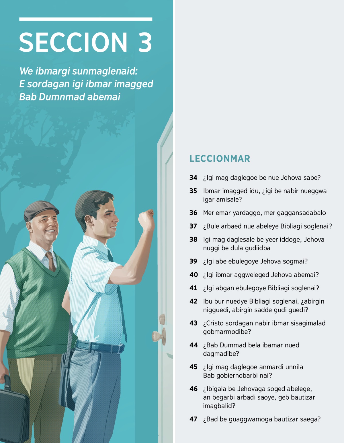 SECCION 3 Edición impresa We ibmargi sunmaglenaid: E sordagan igi ibmar imagged Bab Dumnmad abemai LECCIONMAR 34 ¿Igi mag daglegoe be nue Jehova sabe? 35 Ibmar imagged idu, ¿igi be nabir nueggwa igar amisale? 36 Mer emar yardaggo, mer gaggansadabalo 37 ¿Bule arbaed nue abeleye Bibliagi soglenai? 38 Igi mag daglesale be yeer iddoge, Jehova nuggi be dula gudiidba 39 ¿Igi abe ebulegoye Jehova sogmai? 40 ¿Igi ibmar aggweleged Jehova abemai? 41 ¿Igi abgan ebulegoye Bibliagi soglenai? 42 Ibu bur nuedye Bibliagi soglenai, ¿abirgin nigguedi, abirgin sadde gudi guedi? 43 ¿Cristo sordagan nabir ibmar sisagimalad gobmarmodibe? 44 ¿Bab Dummad bela ibamar nued dagmadibe? 45 ¿Igi mag daglegoe anmardi unnila Bab gobiernobarbi nai? 46 ¿Ibigala be Jehovaga soged abelege, an begarbi arbadi saoye, geb bautizar imagbalid? 47 ¿Bad be guaggwamoga bautizar saega?